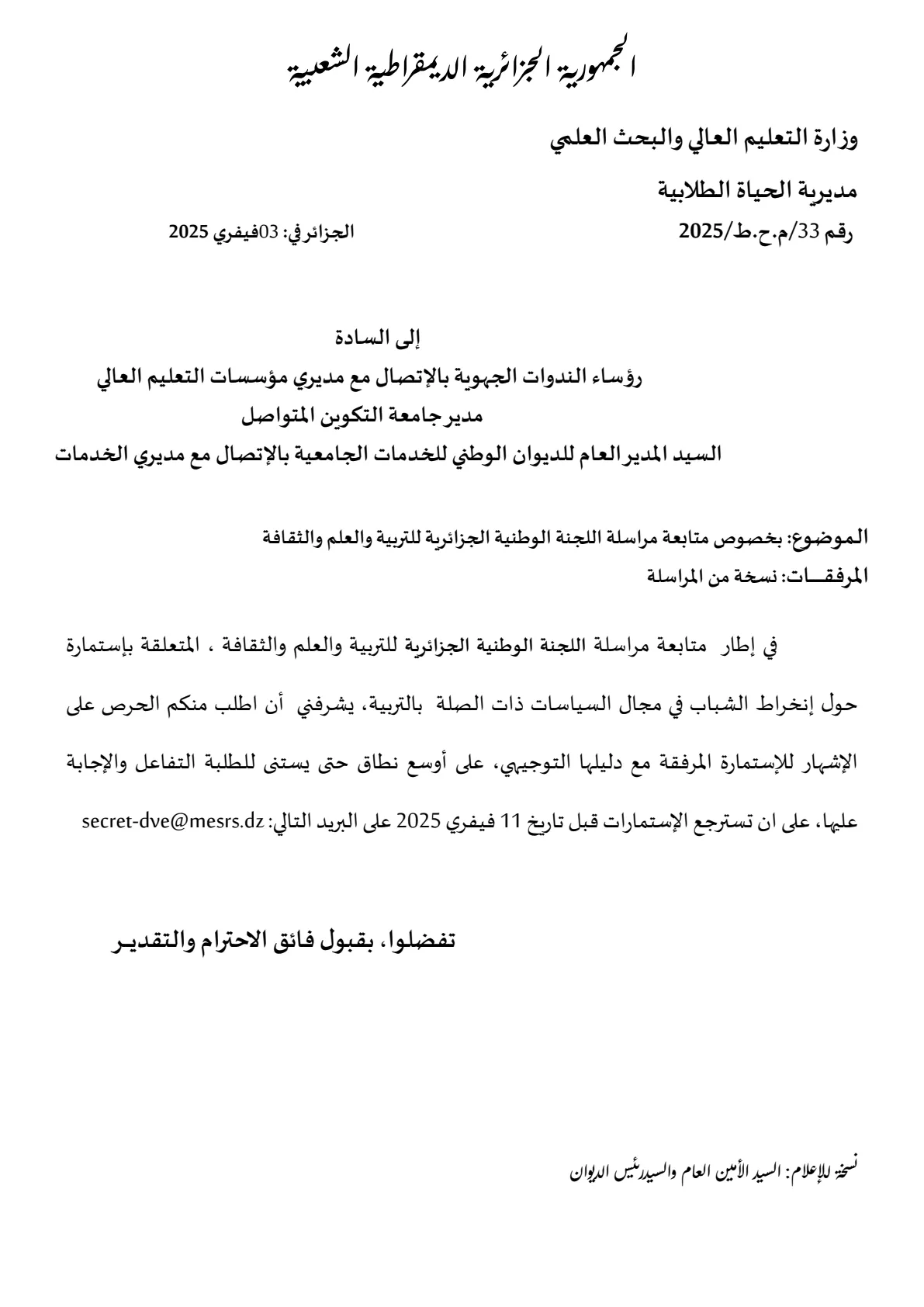 بخصوص متابعة مراسلة اللجنة الوطنية الجزائرية للتربية والعلم والثقافة