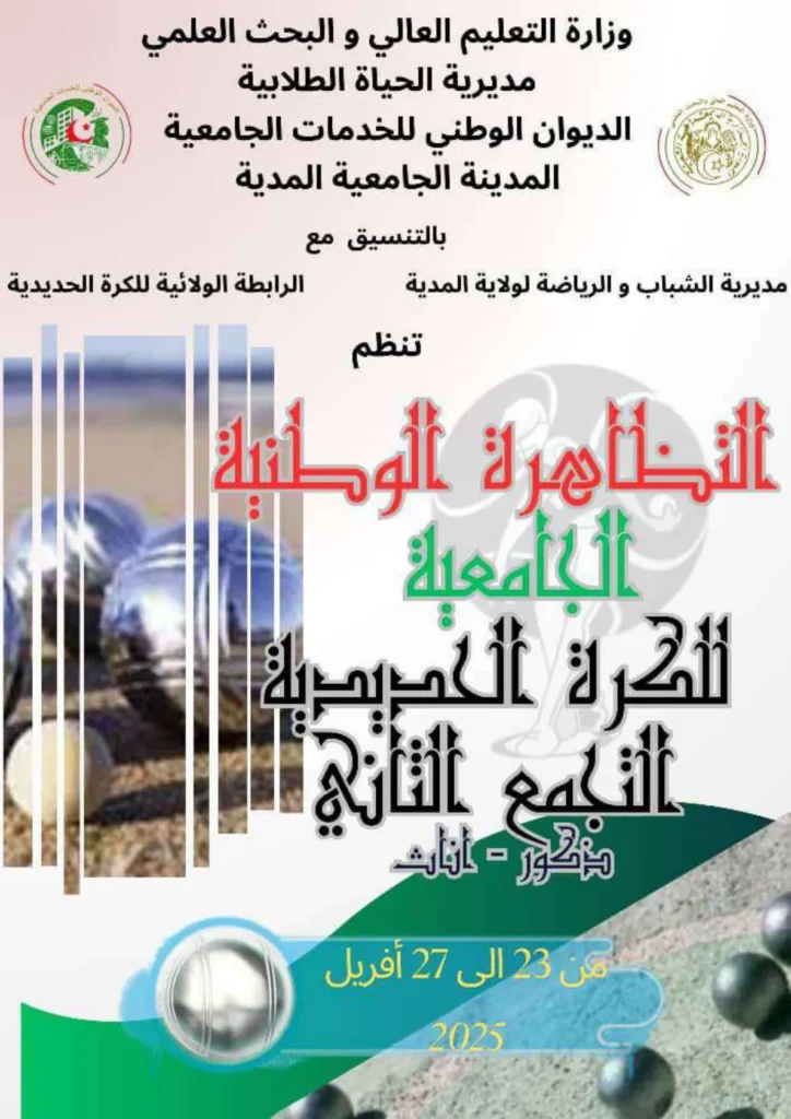 تجسيدًا للبرنامج السنوي (2024-2025)، المتعلق بالأنشطة العلمية والثقافية والرياضية الذي سطرته مديرية الحياة الطلابية بالتنسيق مع الديوان الوطني للخدمات الجامعية والاتحادية الجزائرية للرياضة الجامعية، وتزامنًا مع سبعينية الثورة المباركة، يشرفنا إعلامكم بتنظيم التجمع الثاني للتظاهرة الوطنية الجامعية للكرة الحديدية (ذكور وإناث)، الذي ستنظمه المدينة الجامعية المدية بالتنسيق مع مديرية الشباب والرياضة لولاية المدية والرابطة الولائية للكرة الحديدية، في الفترة الممتدة من 23 إلى 27 أفريل 2025