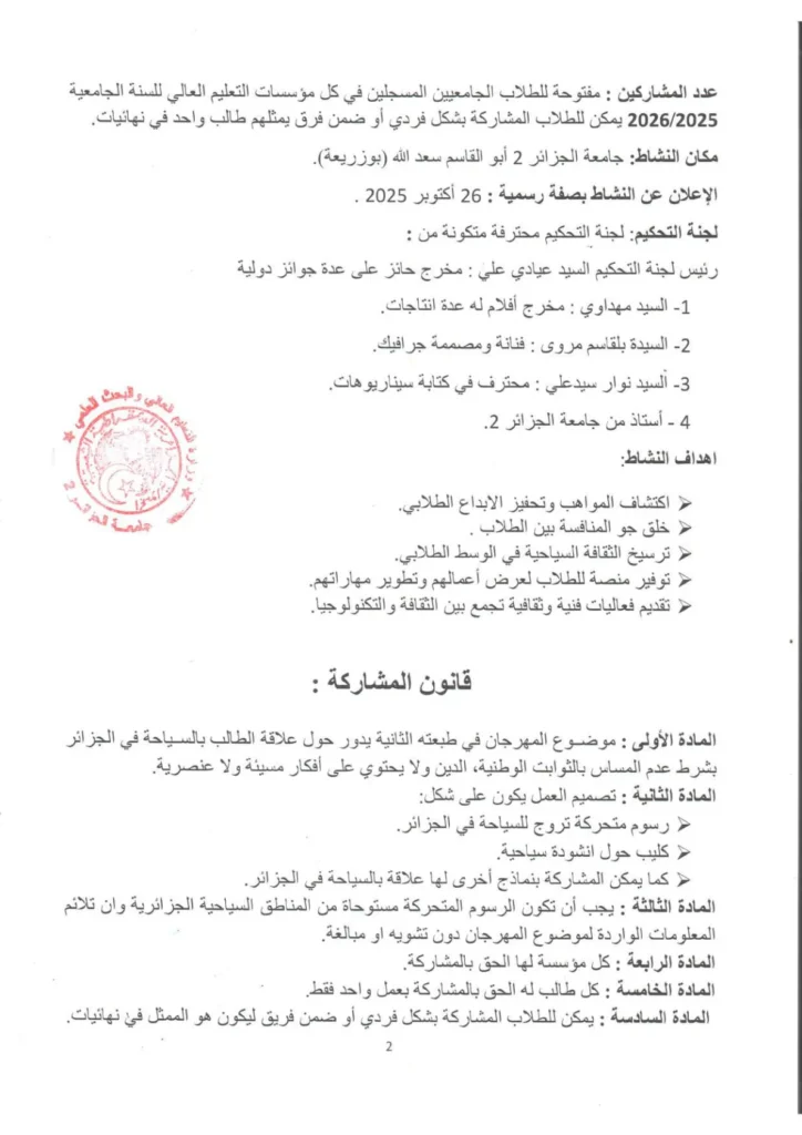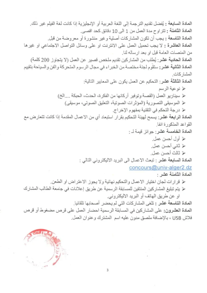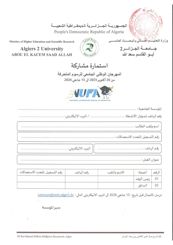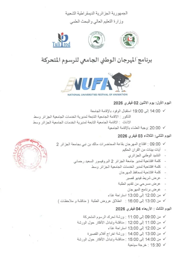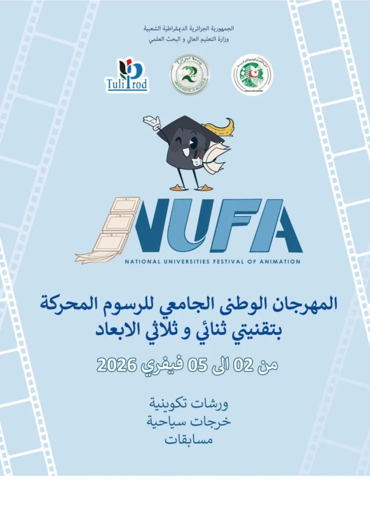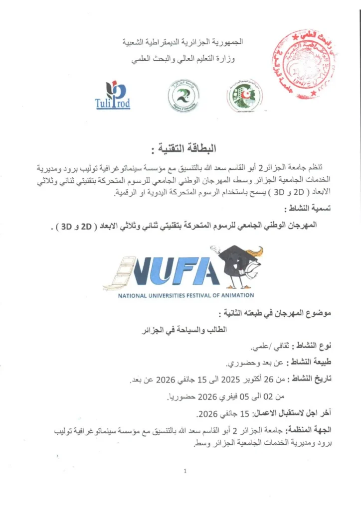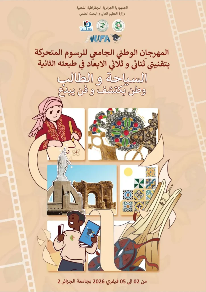 تجسيدا للبرنامج السنوي (2025-2026)، المتعلق بالأنشطة العلمية والثقافية والرياضية، الذي سطرته مديرية الحياة الطلابية بالتنسيق مع الديوان الوطني للخدمات الجامعية، يشرفنا إعلامكم بتنظيم الطبعة الثانية (02)، للمسابقة الوطنية الجامعية للرسوم المحركة بتقنيتي ثنائي وثلاثي الأبعاد، عن بعد وحضوري التي ستنظمها جامعة الجزائر 02 أبو القاسم سعد الله، في الفترة الممتدة من 26 أكتوبر 2025 إلى 05 فيفري 2026. وتجرى على مرحلتين: