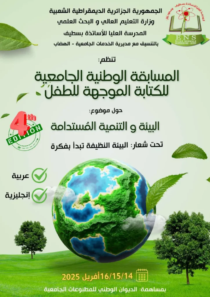 تجسيدا للبرنامج السنوي 2024-2025، المتعلق بالأنشطة العلمية والثقافية والرياضية الذي سطرته مديرية الحياة الطلابية بالتنسيق مع الديوان الوطني للخدمات الجامعية، يشرفنا إعلامكم بدعوة المشاركة في الطبعة الرابعة للمسابقة الوطنية الجامعية للكتابة الموجهة للطفل حول موضوع « البيئة والتنمية المستدامة » باللغتين العربية والإنجليزية التي ستنظمها المدرسة العليا للأساتذة مسعود زغار بسطيف بالتنسيق مع مديرية الخدمات الجامعية الهضاب سطيف و بمساهمة الديوان الوطني للمطبوعات الجامعية، في الفترة الممتدة من 14 إلى 16 أفريل 2025 تحت شعار « البيئة النظيفة تبدأ بفكرة »، على أن ترسل استمارات تأكيد المشاركة قبل تاريخ 10 مارس 2025