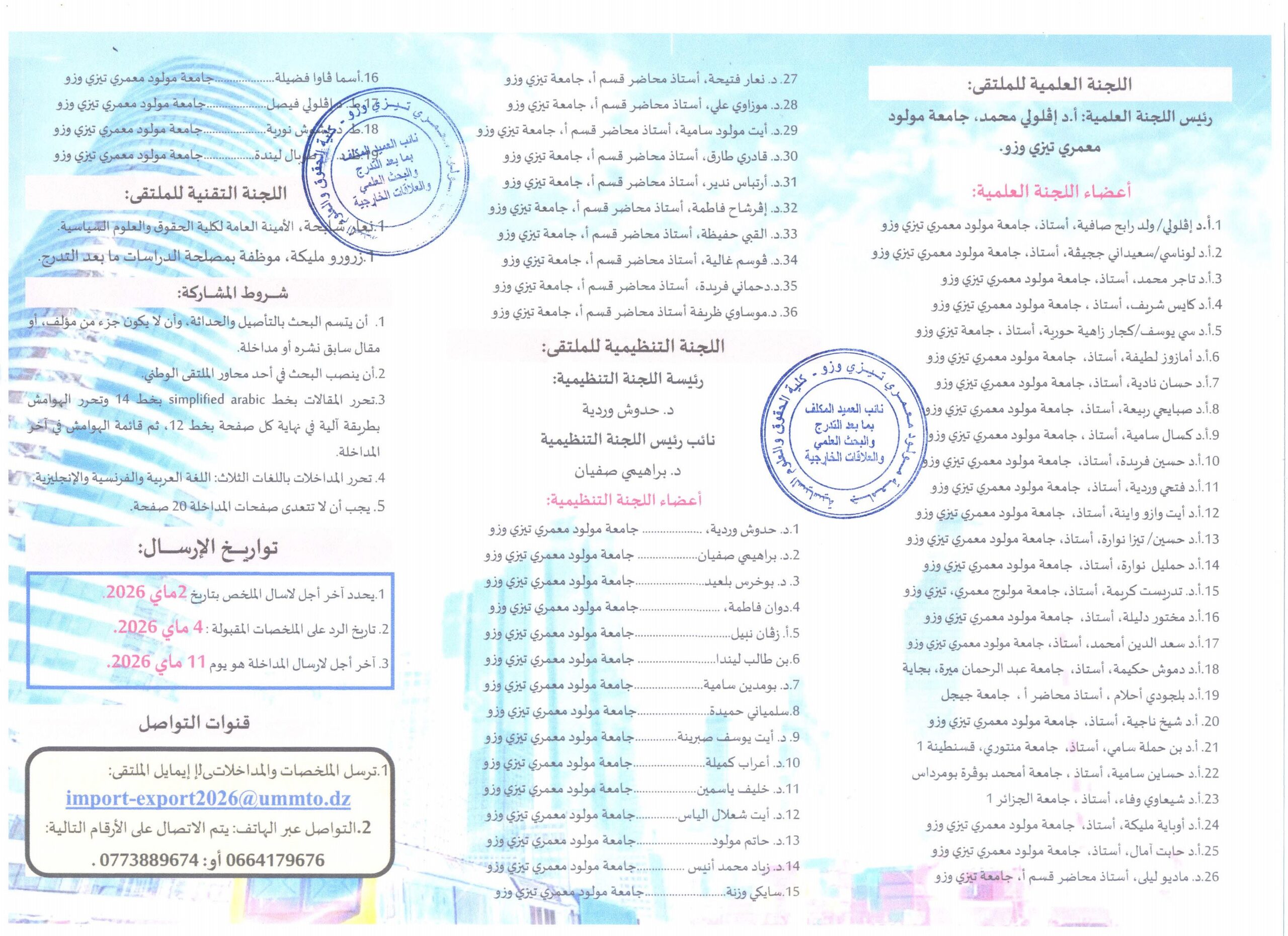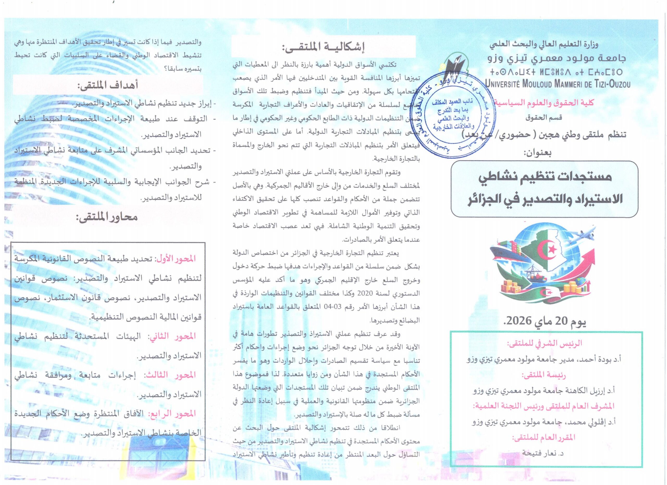 تنظم كلية الحقوق و العلوم السياسية ملتقى وطني بعنوان: « مستجدات تنظيم نشاطي الاستيراد و التصدير في الجزائر » يوم 20 ماي 2026