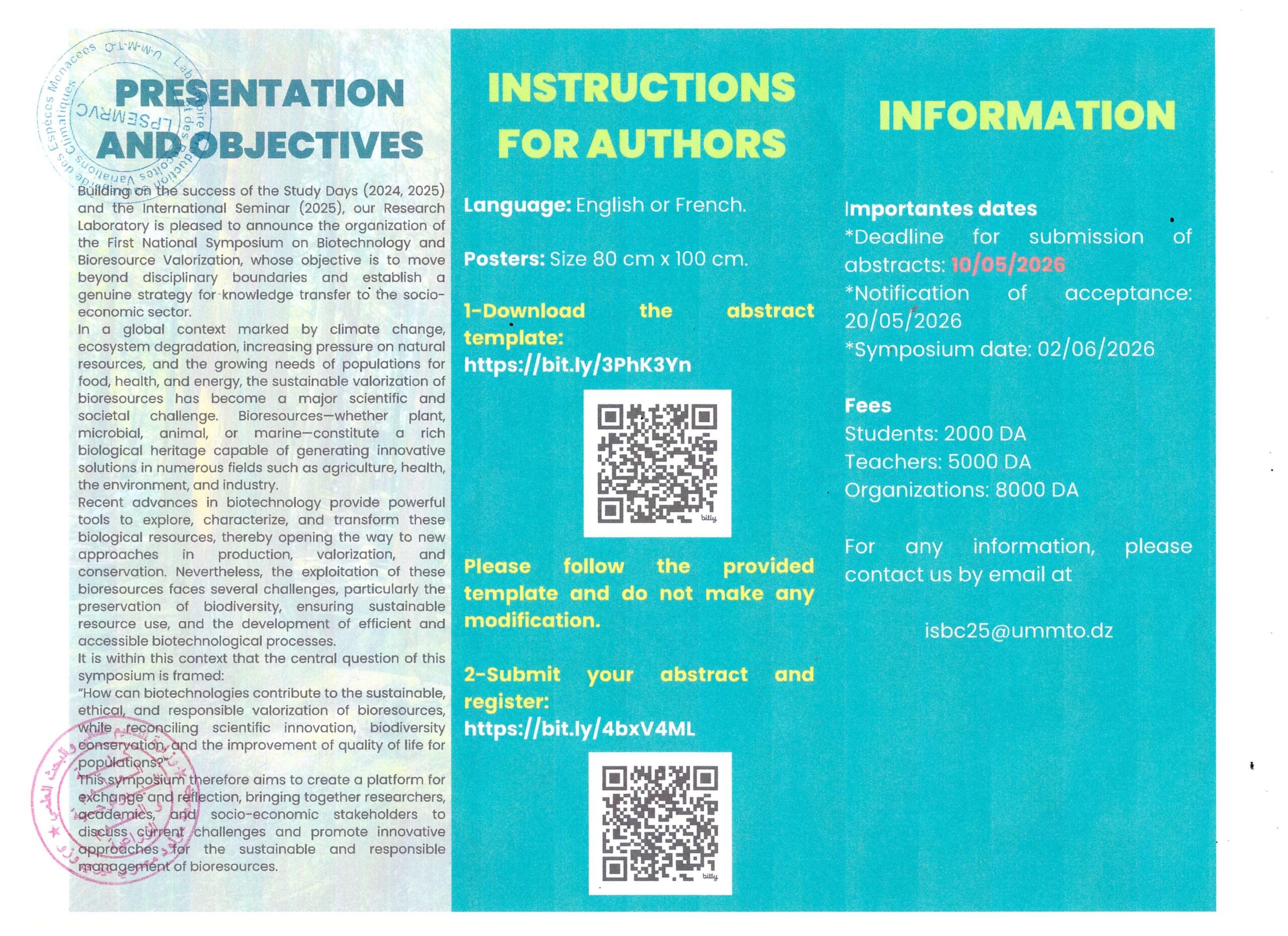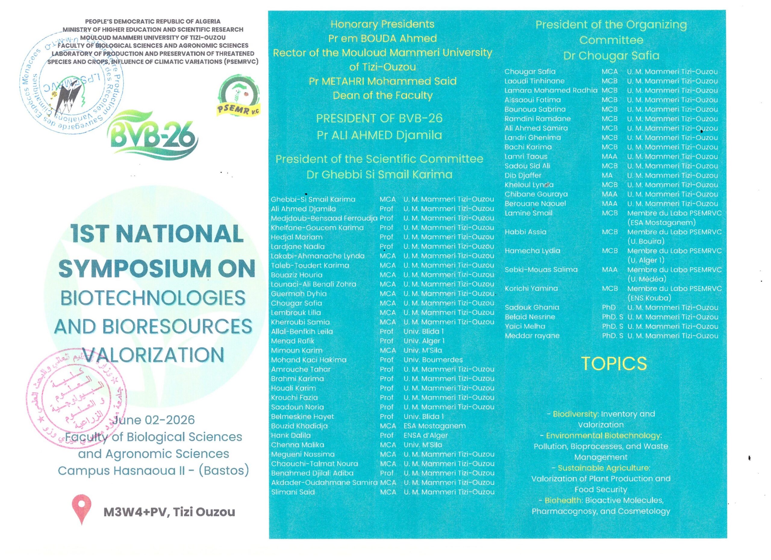 The faculty of biological sciences and agronomic sciences orgenize the 1st national symposium on : « Biotechnologies and Bioresources valorisation » on jun 02 nd ,2026