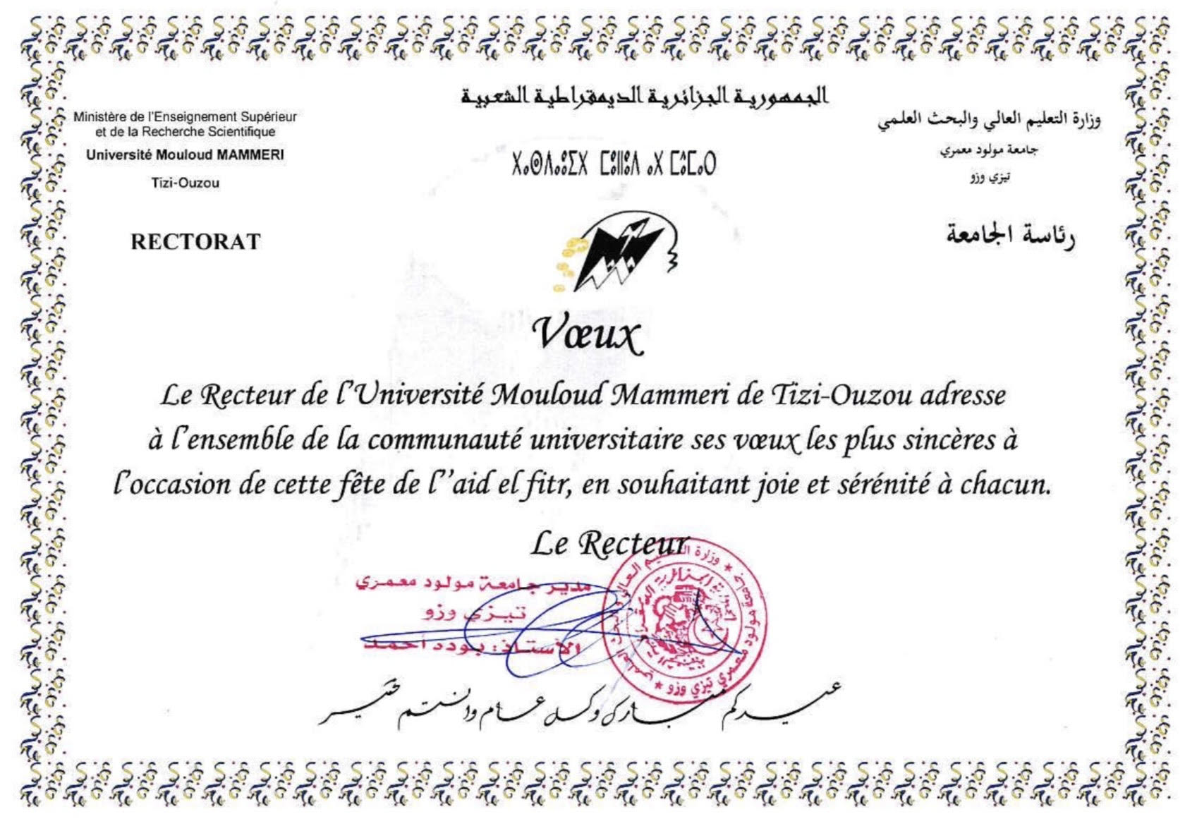 Aid El Fitr 2026: Vœux du Recteur de l’UMMTO