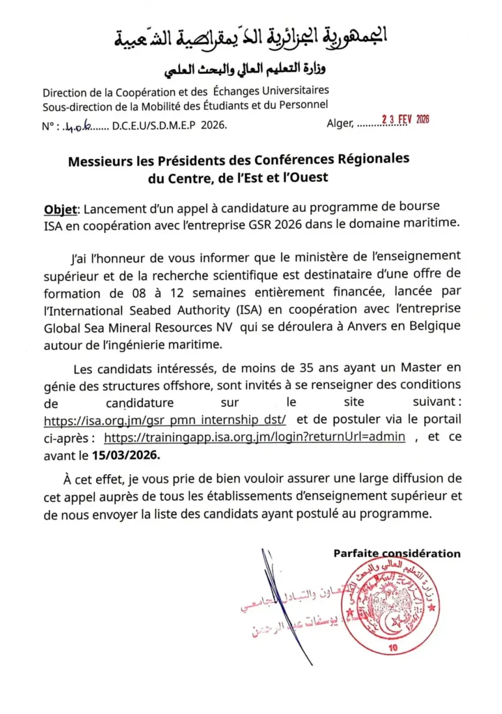Appel à candidature au programme de bourse ISA en coopération avec l’entreprise GSR 2026 dans le domaine maritime