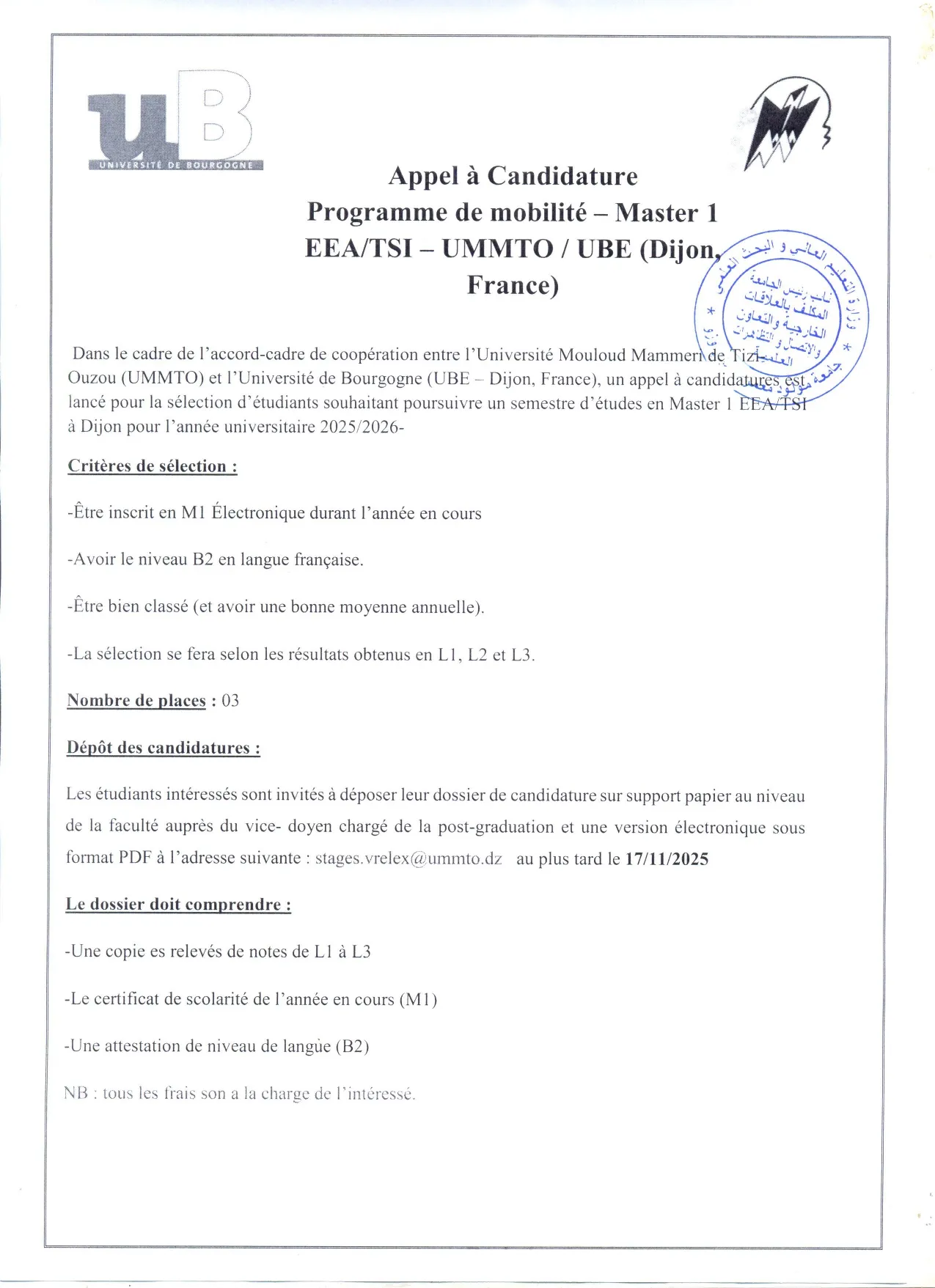 Appel à candidature au programme de mobilité master 1 EEA/TSI-UMMTO / USB (Dijon-France)