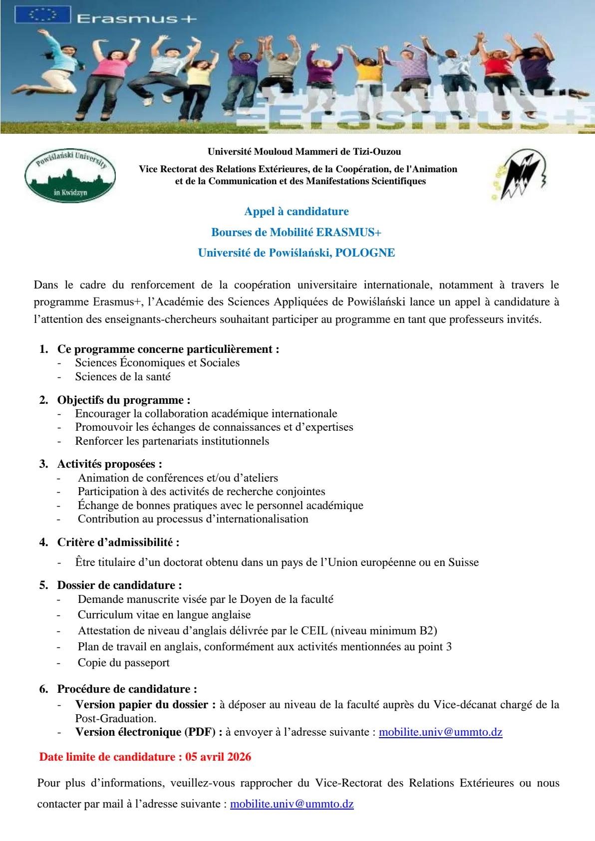 Appel à candidature : Bourses de Mobilité ERASMUS+ (Université Powiślański de POLOGNE)