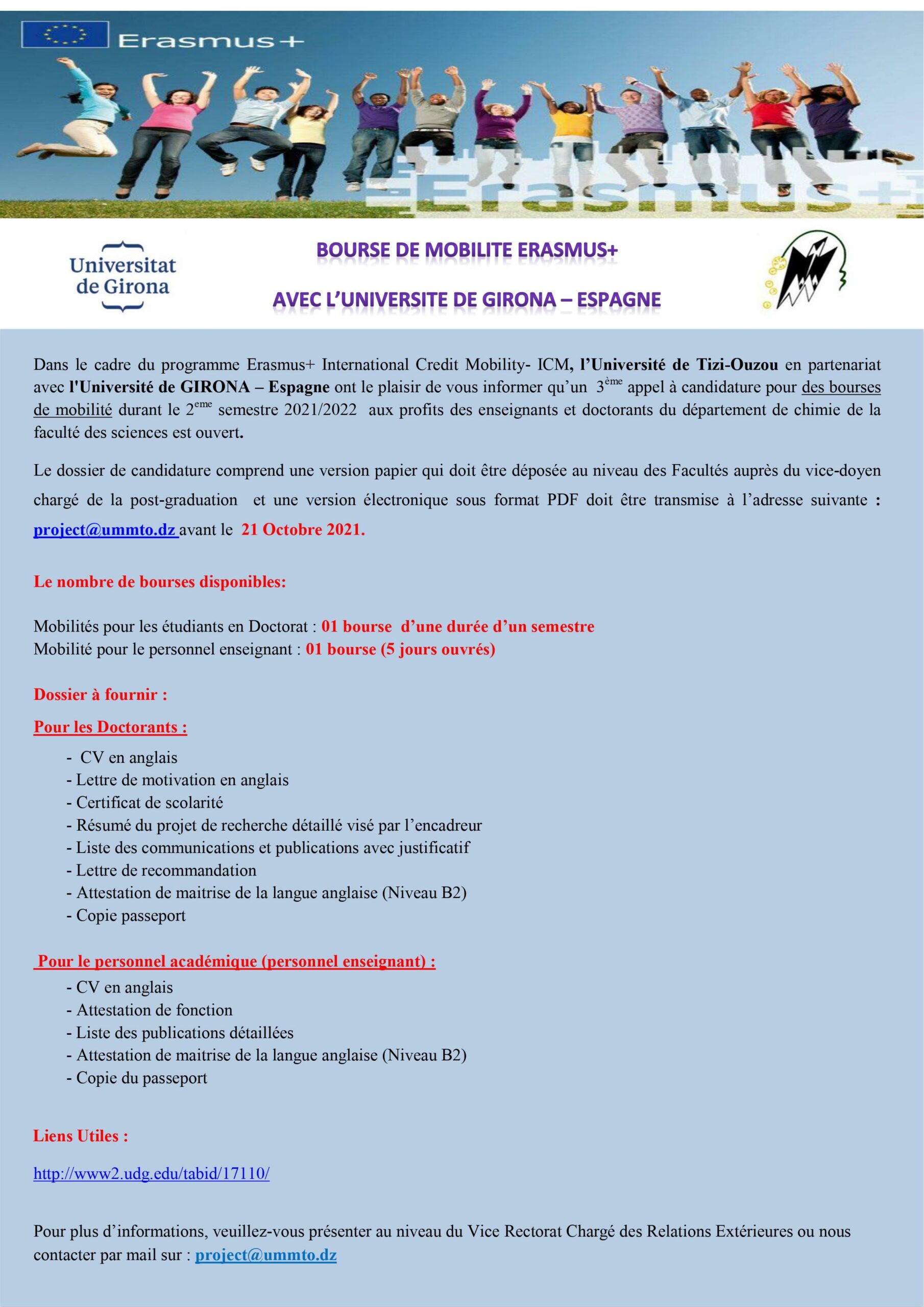 Appel à candidature dans le cadre du programme de mobilité Erasmus+ avec l’université de GIRONA–Espagne