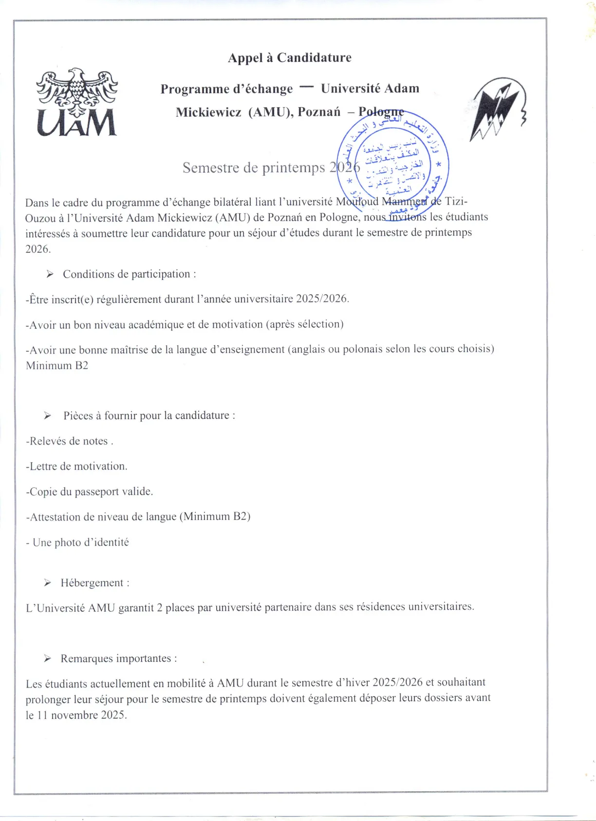 Appel à Candidature dans le cadre du Programme d’échange avec l’Université Adam Mickiewicz de Pologne