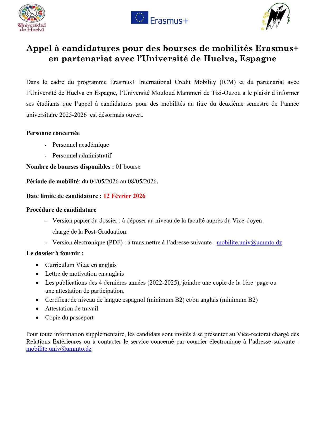 Appel à candidatures pour des bourses de mobilités Erasmus+ en partenariat avec l’Université de Huelva, Espagne