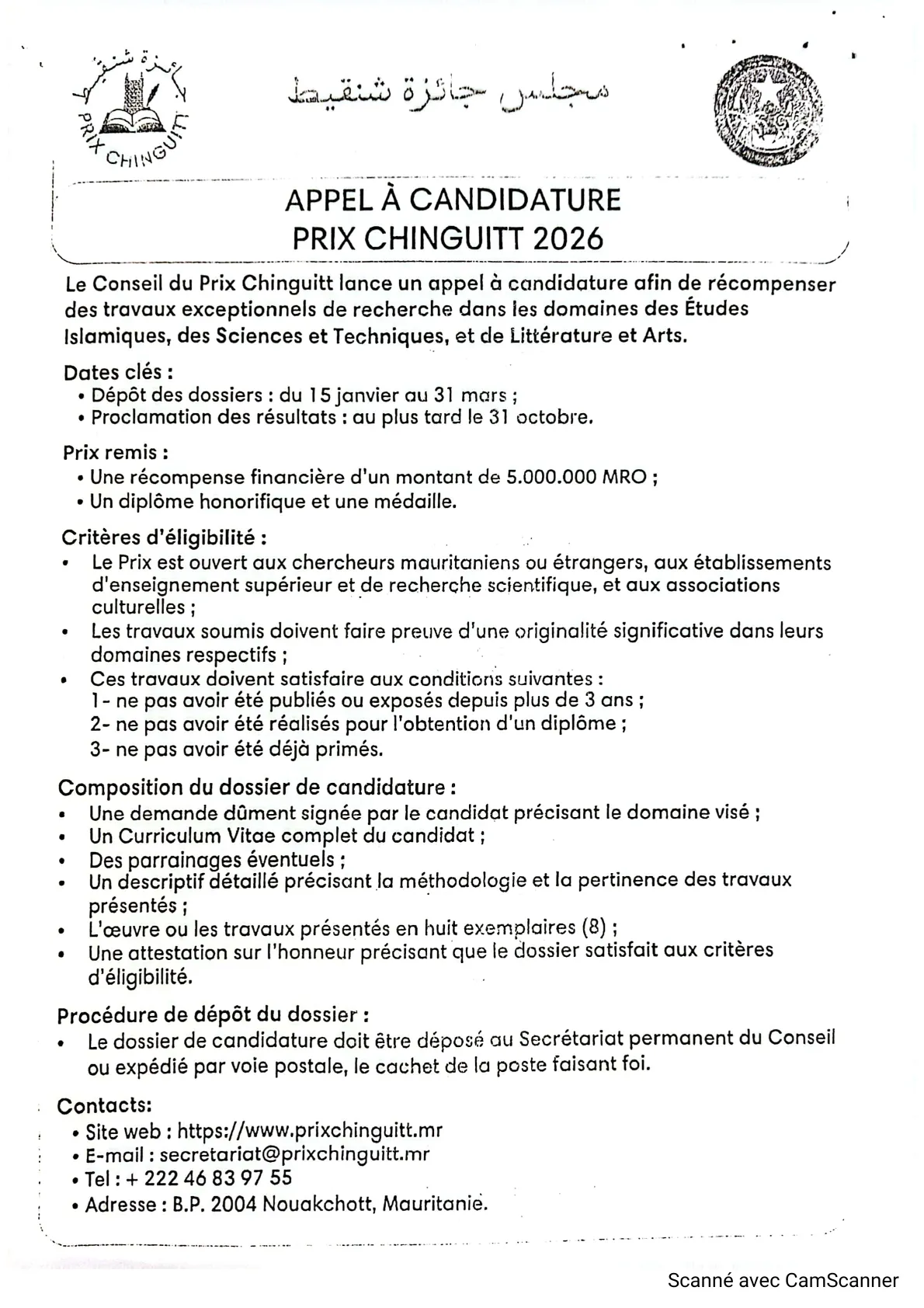 Nous avons l’honneur de vous faire part que l’Ambassade de la République Islamique de Mauritanie à Addis-Abeba, informe les Etats membres que le Conseil du prix Chinguitt lance un appel à candidature pour le prix Chinguitt 2026, récompensant les travaux de recherche dans les domaines des études islamiques, des sciences et technologies, ainsi que de littérature et des arts.