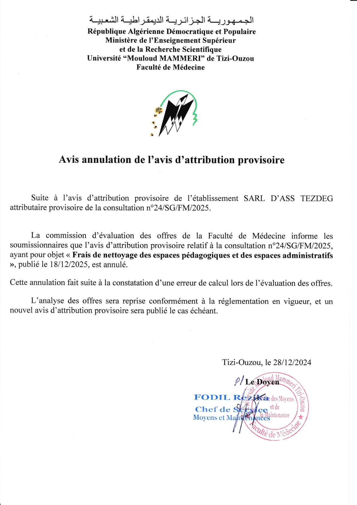 L’université Mouloud Mammeri de Tizi-Ouzou informe l’ensemble des soumissionnaires ayant participé à la consultation N°32/SDMM/RECTORAT/UMMTO/2025 portant « Frais de Nettoyage...
