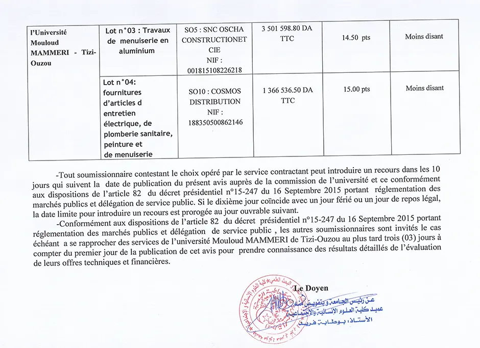 Avis d’attribution n°13/FSHS/UMMTO/2024