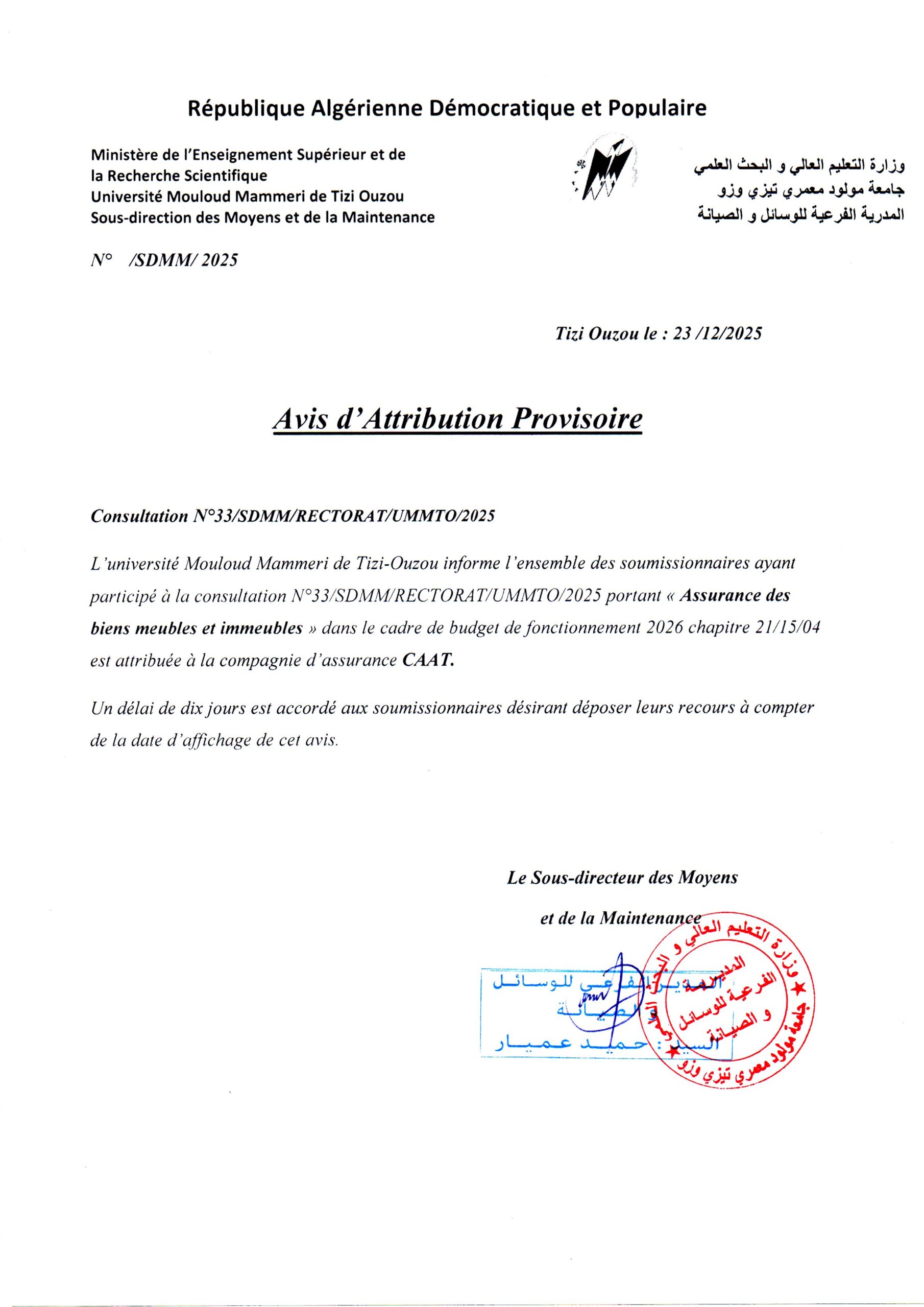 L’université Mouloud Mammeri de Tizi-Ouzou informe l’ensemble des soumissionnaires ayant participé à la consultation N°33/SDMM/RECTORAT/UMMTO/2025 portant « Assurance des biens meubles et immeubles », dans le cadre du budget de fonctionnement 2026, chapitre 21/15/04, est attribuée à la compagnie d’assurance CAAT.