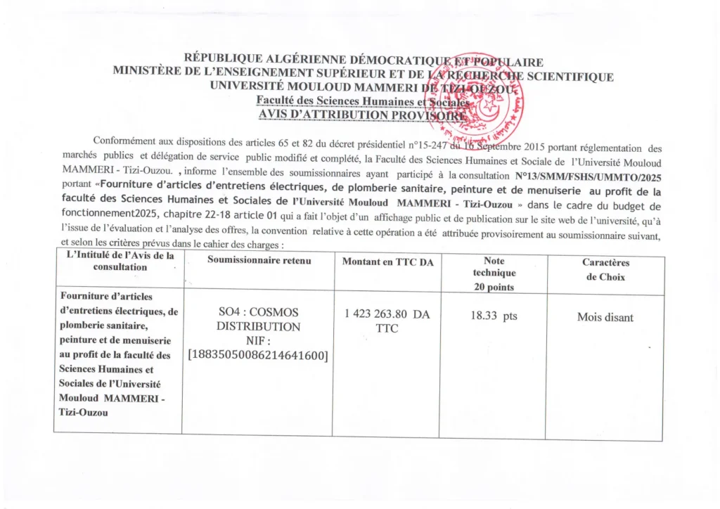 Avis d’attribution provisoire de la consultation N° 13/SMM/FSHS/UMMTO/2025
