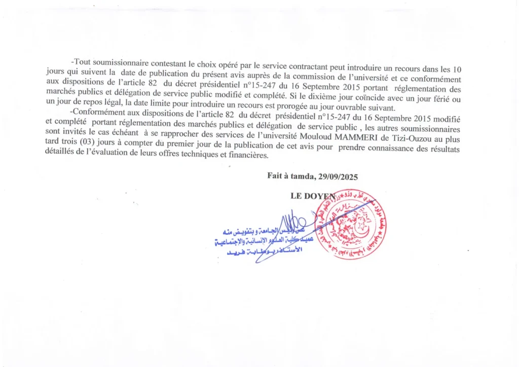 Avis de Consultation Numéro 13/FLL/UMMTO/2025 Dans le cadre du budget de fonctionnement 2025, La Faculté des Lettres et Langues de l’Université Mouloud MAMMERI de Tizi-Ouzou...