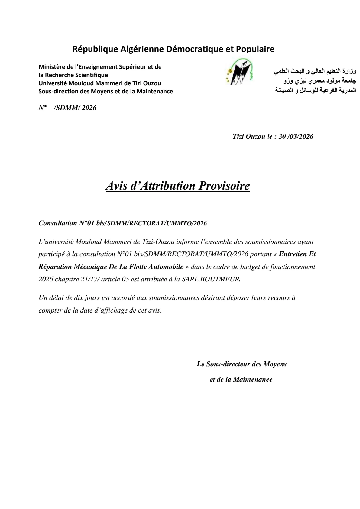 Avis d’Attribution Provisoire de la consultation N°01 bis/SDMM/RECTORAT/UMMTO/2026