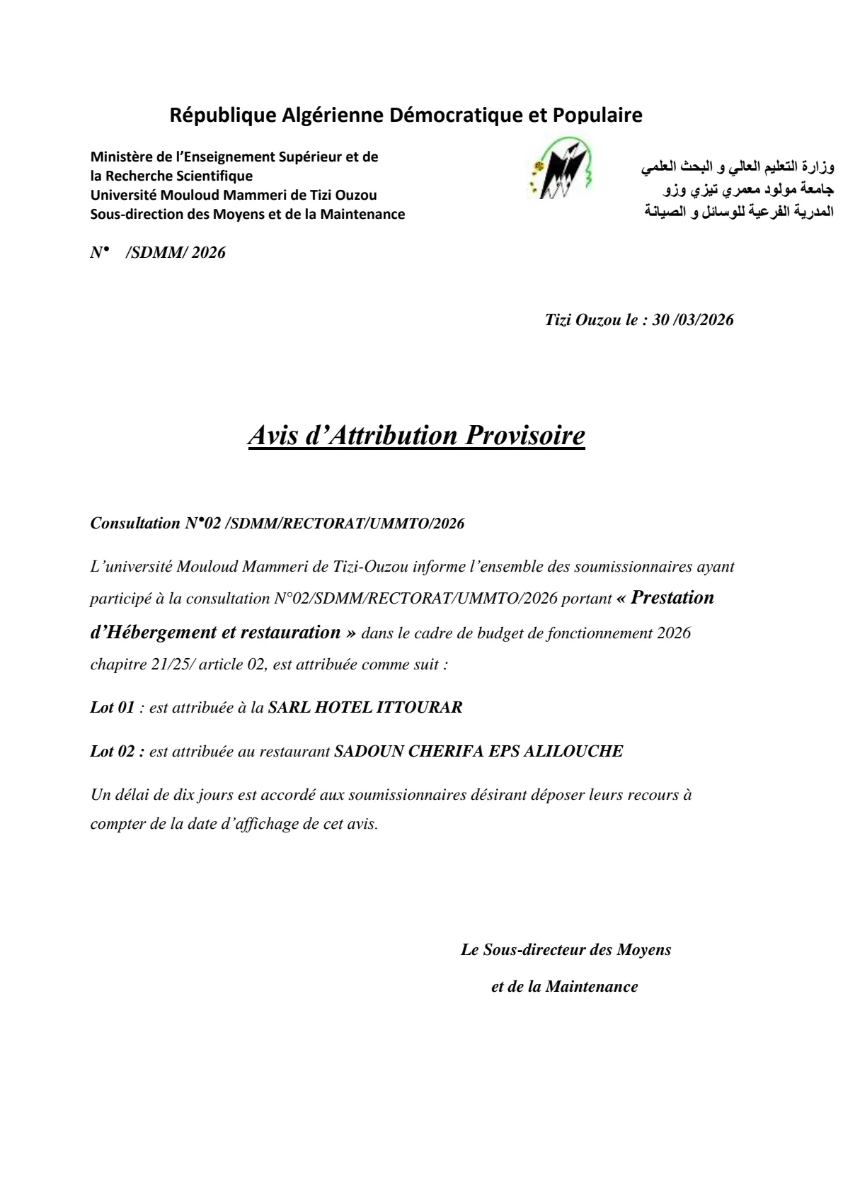Avis d’Attribution Provisoire de la consultation N°02 /SDMM/RECTORAT/UMMTO/2026