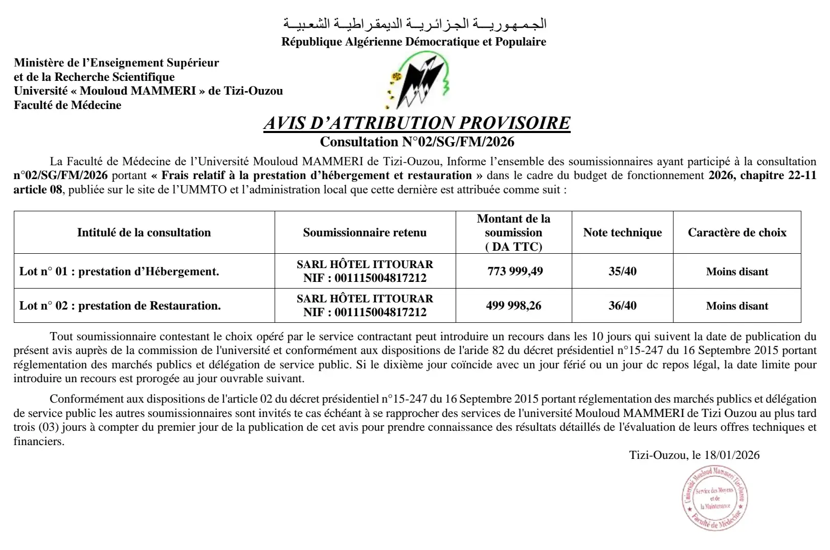 L’université Mouloud Mammeri de Tizi-Ouzou informe l’ensemble des soumissionnaires ayant participé à la consultation N°32/SDMM/RECTORAT/UMMTO/2025 portant « Frais de Nettoyage...