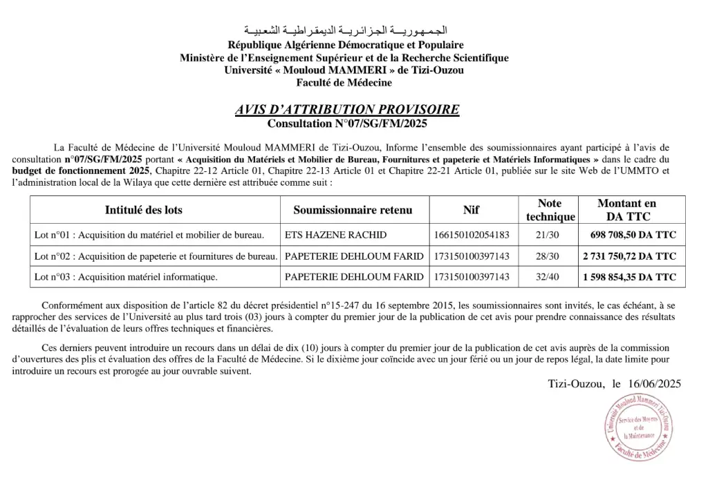 AVIS D’ATTRIBUTION PROVISOIRE de la consultation N°07/SG/FM/2025