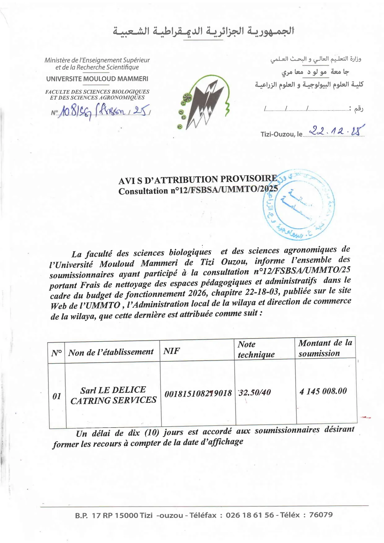Avis d’attribution provisoire de la consultation n°12/FSBSA/UMMTO/25