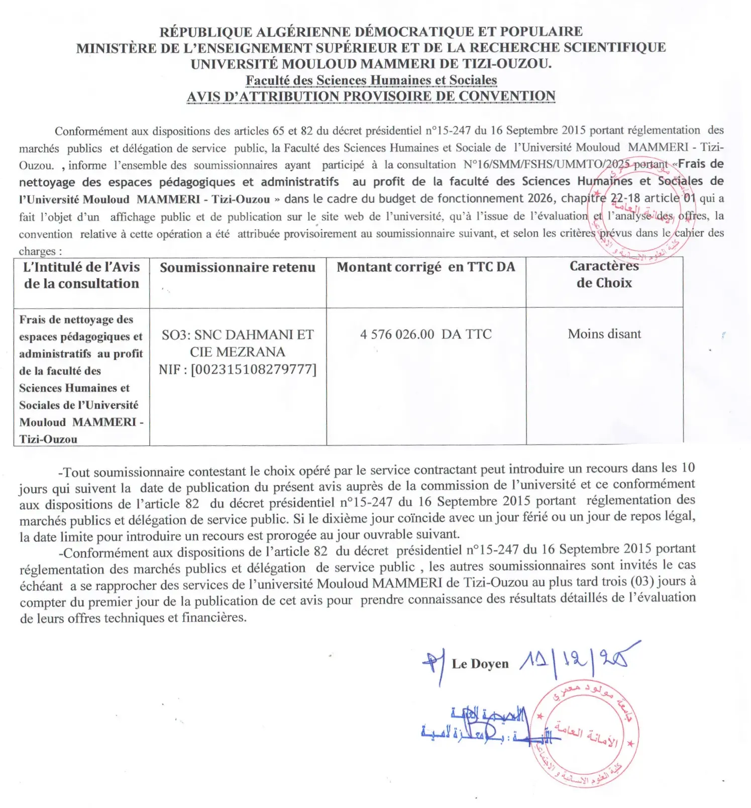 Avis d’attribution provisoire de la consultation N°16/SMM/FSHS/UMMTO/2025