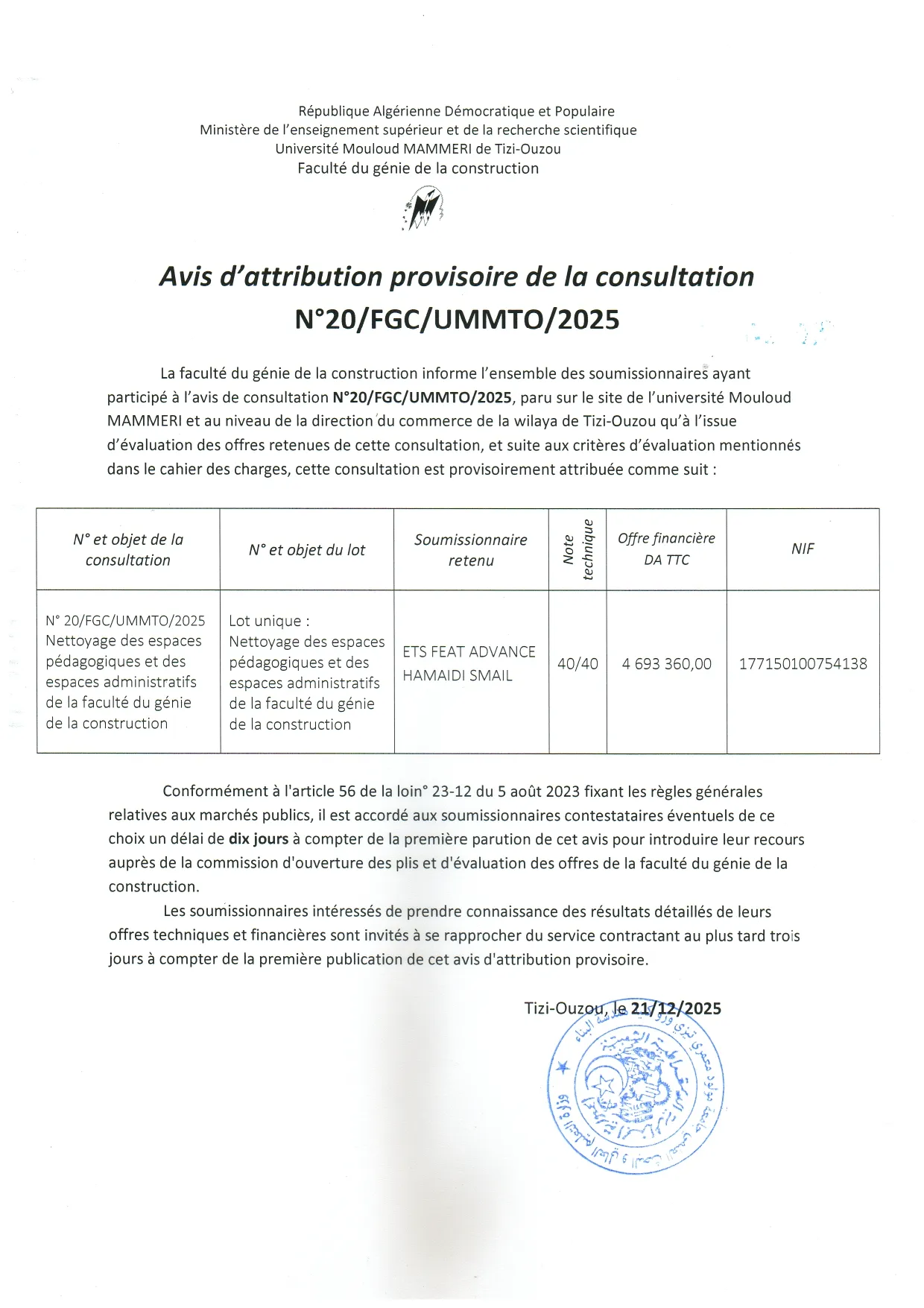 Avis d’attribution provisoire de la consultation N°20/FGC/UMMTO/2025