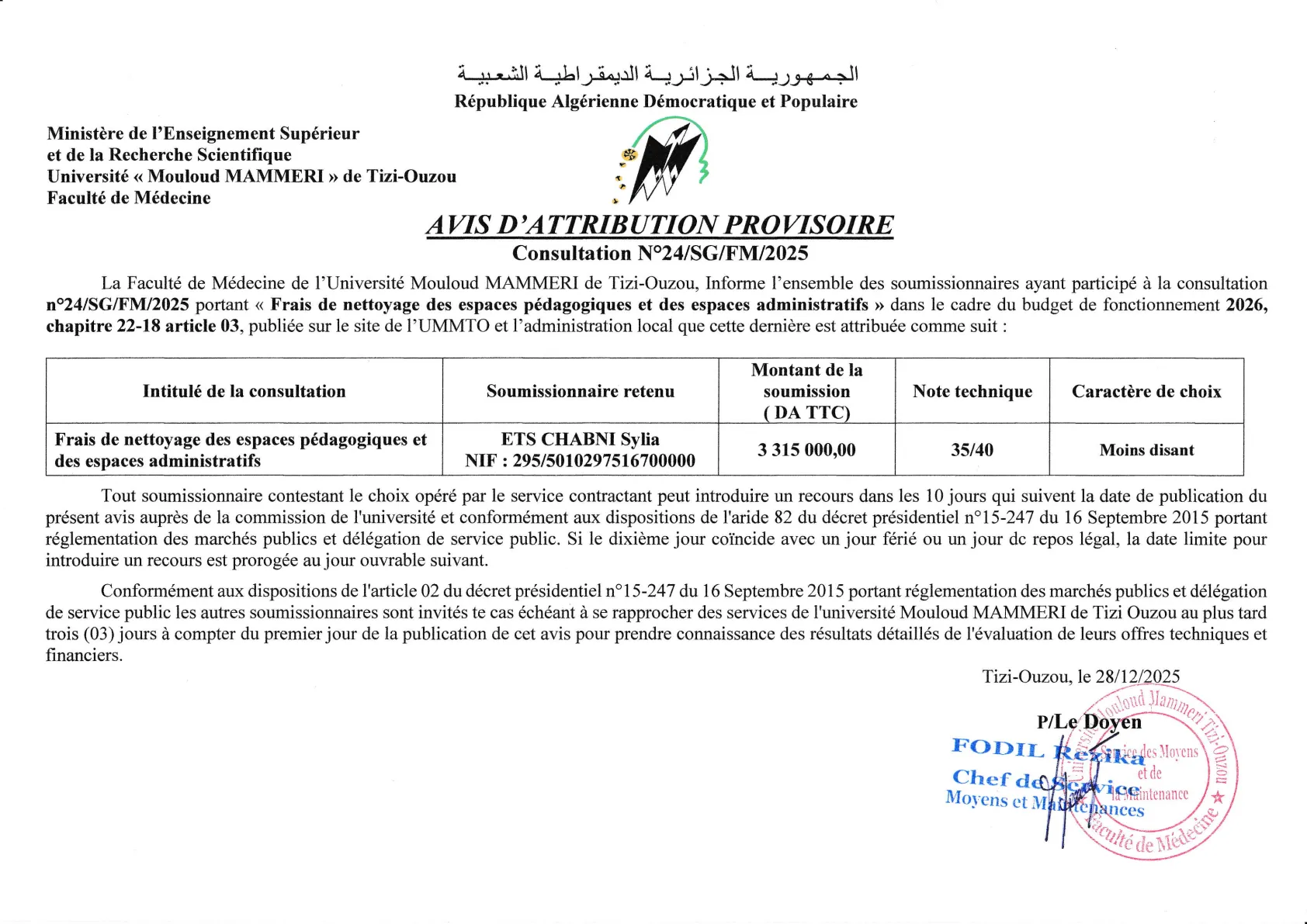 L’université Mouloud Mammeri de Tizi-Ouzou informe l’ensemble des soumissionnaires ayant participé à la consultation N°32/SDMM/RECTORAT/UMMTO/2025 portant « Frais de Nettoyage...
