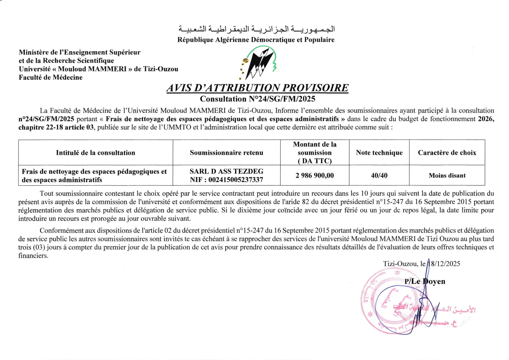 La Faculté de Médecine de l’Université Mouloud MAMMERI de Tizi-Ouzou lance une consultation portant sur : « Les frais de nettoyage des espaces pédagogiques et des espaces...