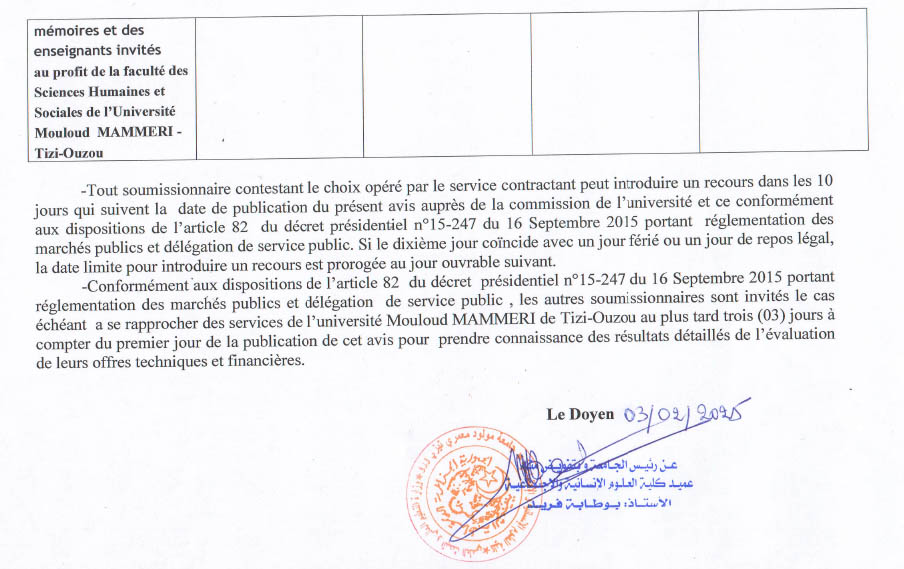 Avis de Consultation N°15/SMM/FSHS/UMMTO/2025 Dans le cadre du budget de fonctionnement 2025, La Faculté des Sciences Humaines et Sociales de l’Université Mouloud MAMMERI de...