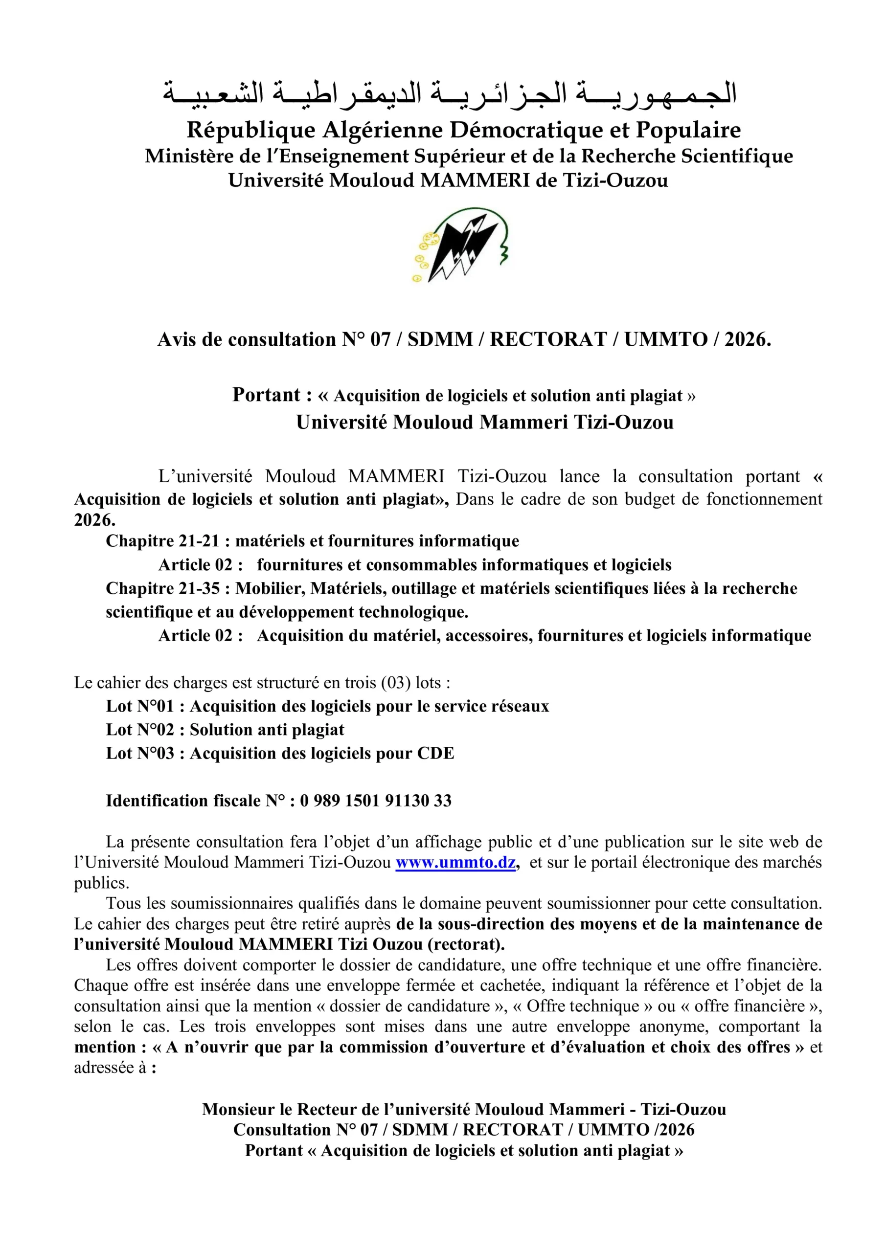 Avis de Consultation N° 02/FSBSA/UMMTO/2026La Faculté des Sciences Biologiques et des Sciences Agronomiques de l’Université Mouloud MAMMERI de Tizi-Ouzou lance une consultation...