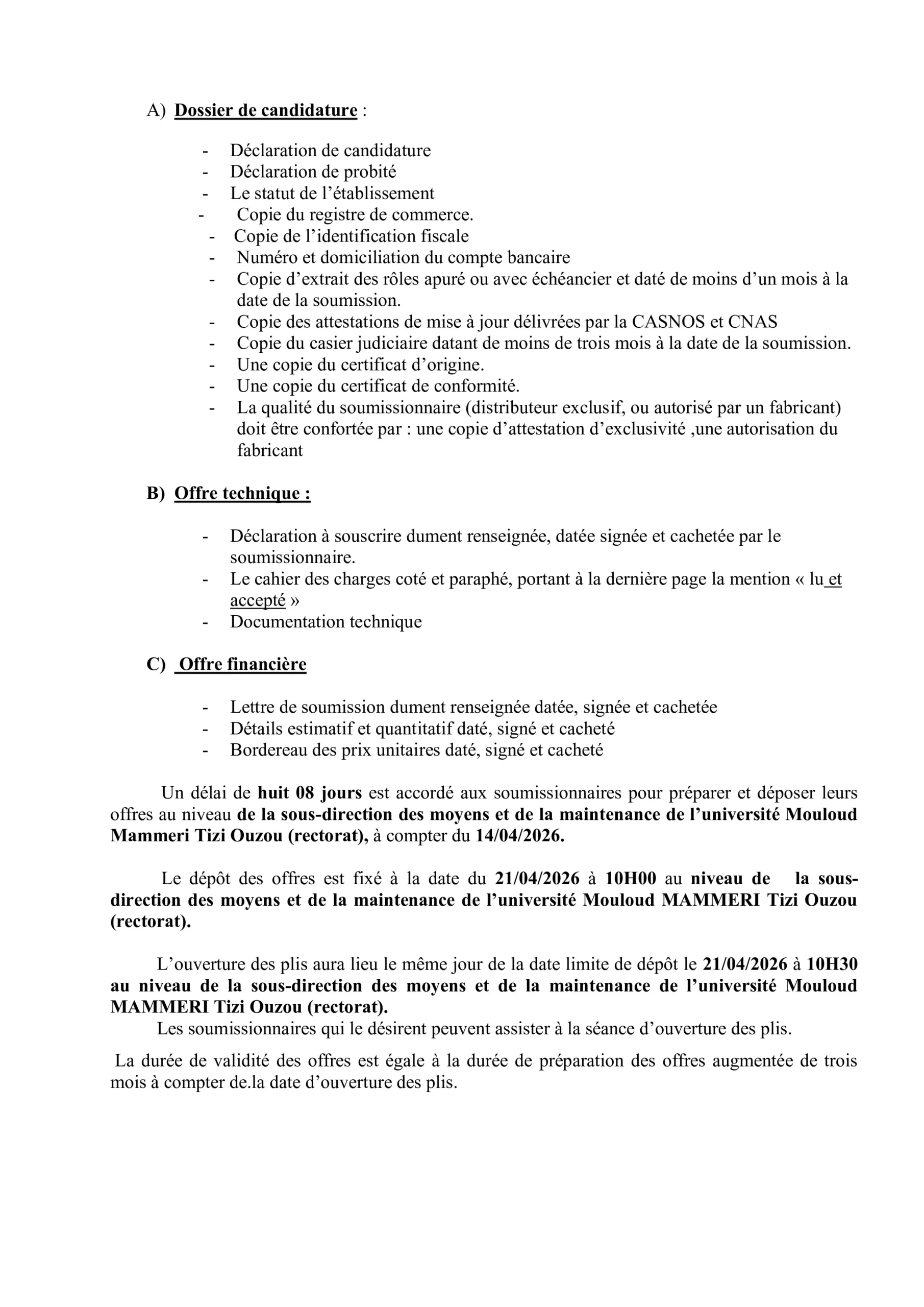 Avis de Consultation N° 01/FSBSA/UMMTO/2026La faculté des Sciences Biologiques et des Sciences Agronomiques de l’Université Mouloud MAMMERI de Tizi-Ouzou lance une consultation...