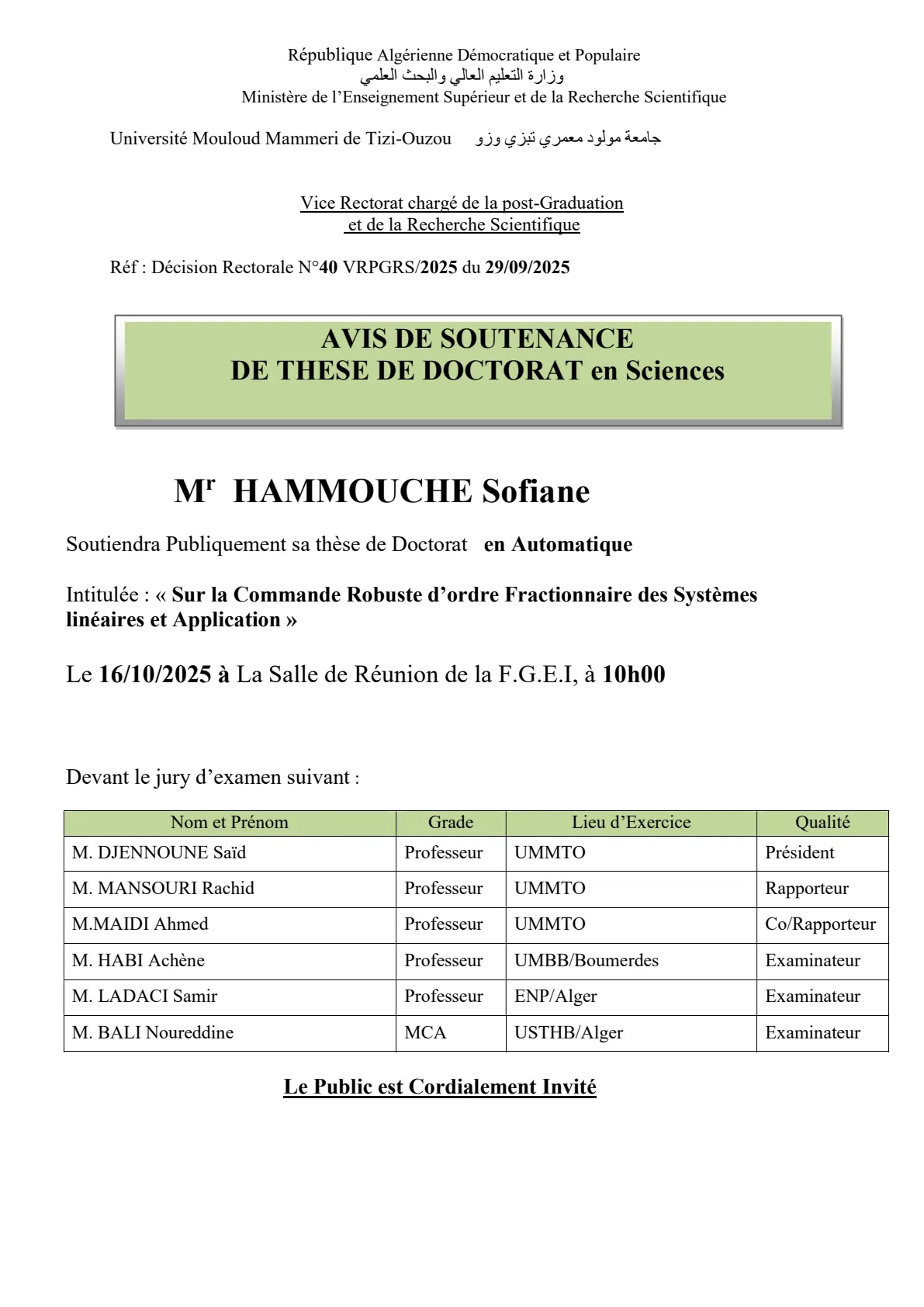 13 Oct 2025 | Avis de soutenance, Doctorat en sciences