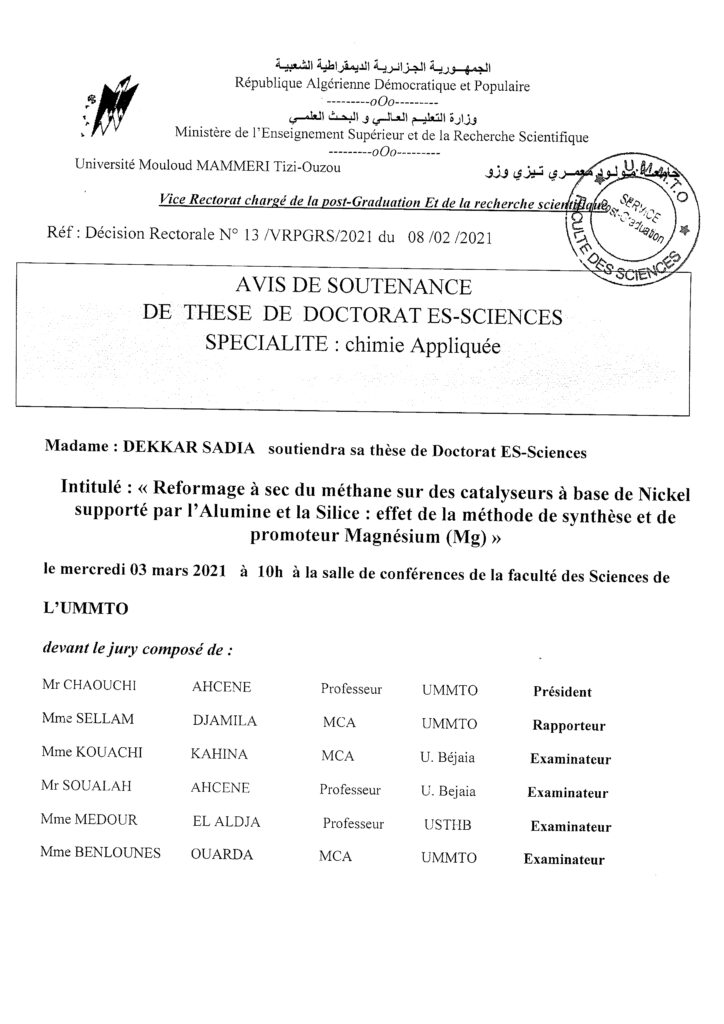 Avis de soutenance de thèse de Doctorat en Chimie Appliquée par Mme DEKKAR Sadia