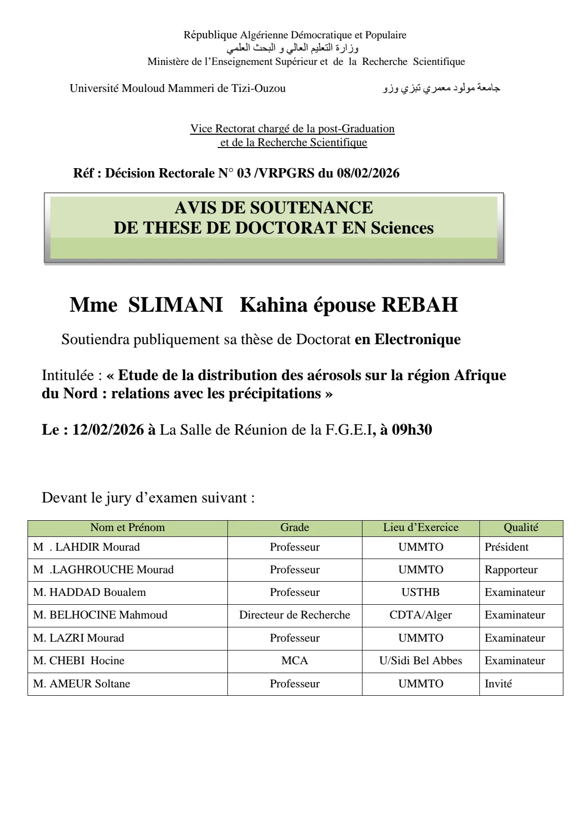 Avis de soutenance de thèse de doctorat LMD en Electronique de Madame CHOUCHANE Lamia