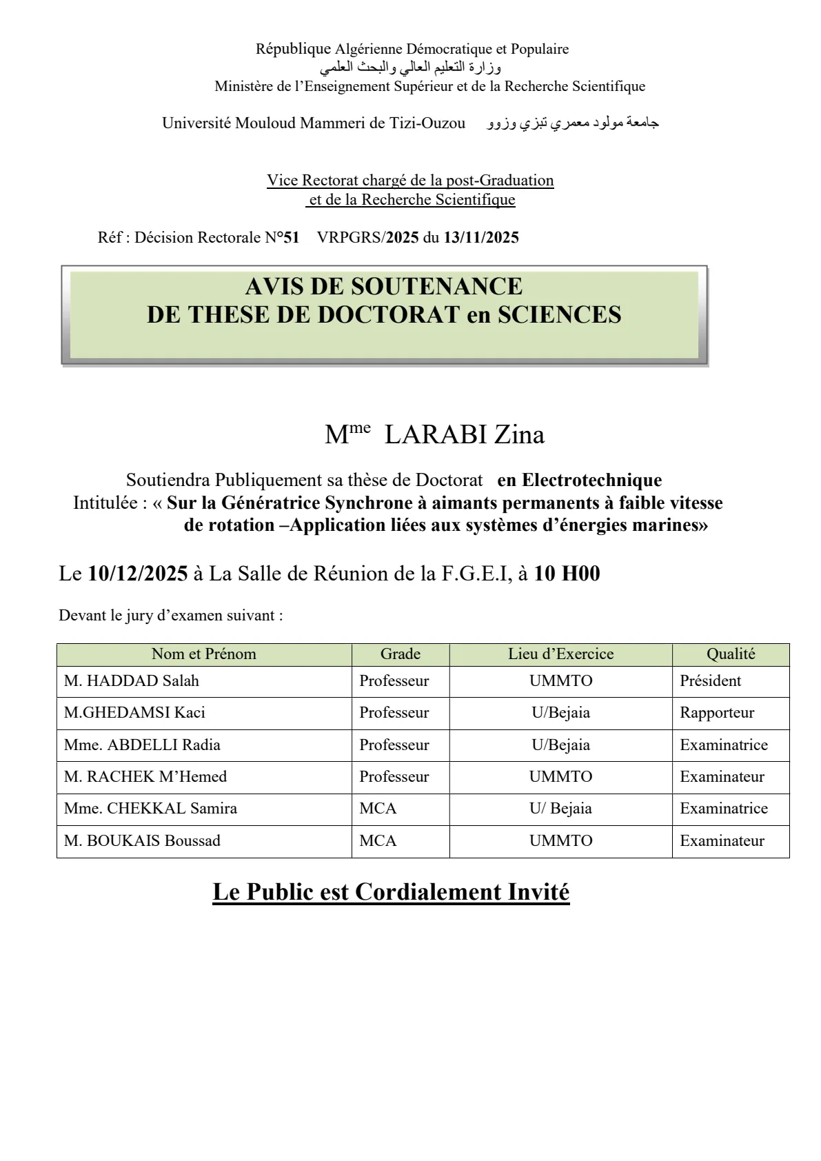 Avis de soutenance de thèse de doctorat en Electrotechnique de Madame LARABI Zina