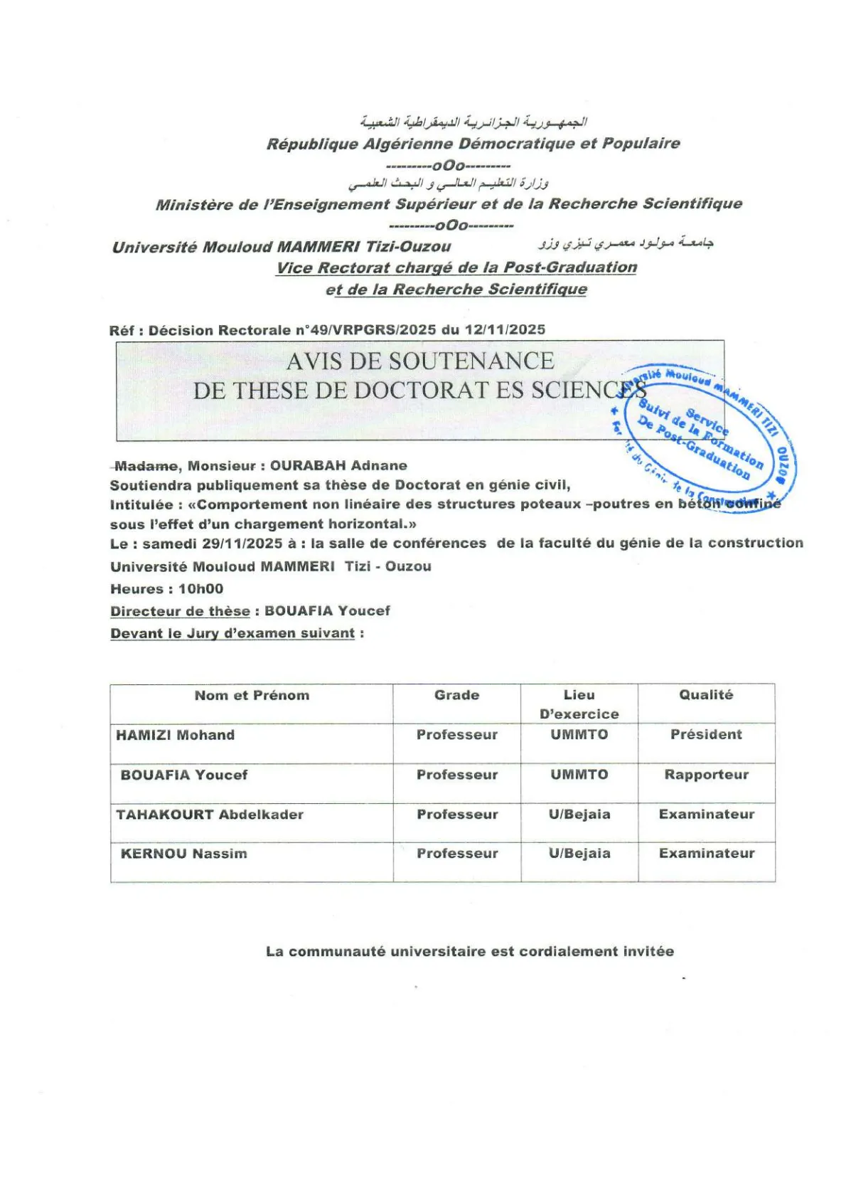 Avis de soutenance de thèse de doctorat en Génie Civil de Monsieur OURABAH Adnane