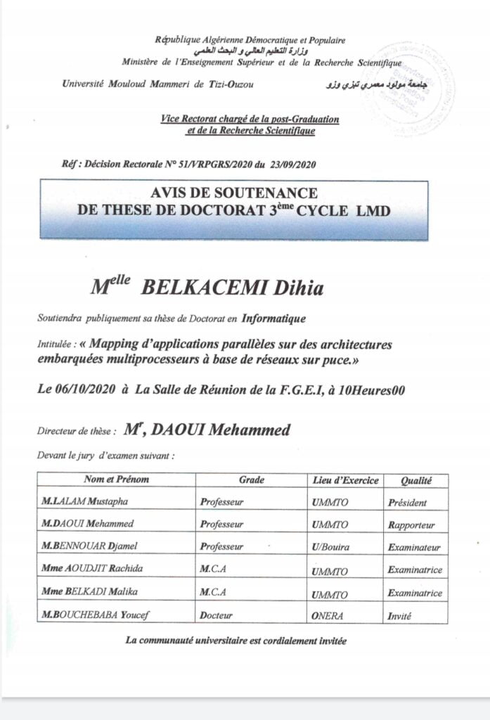 Avis de soutenance de thèse de Doctorat en Informatique de mlle BELKACEMI DIHIA
