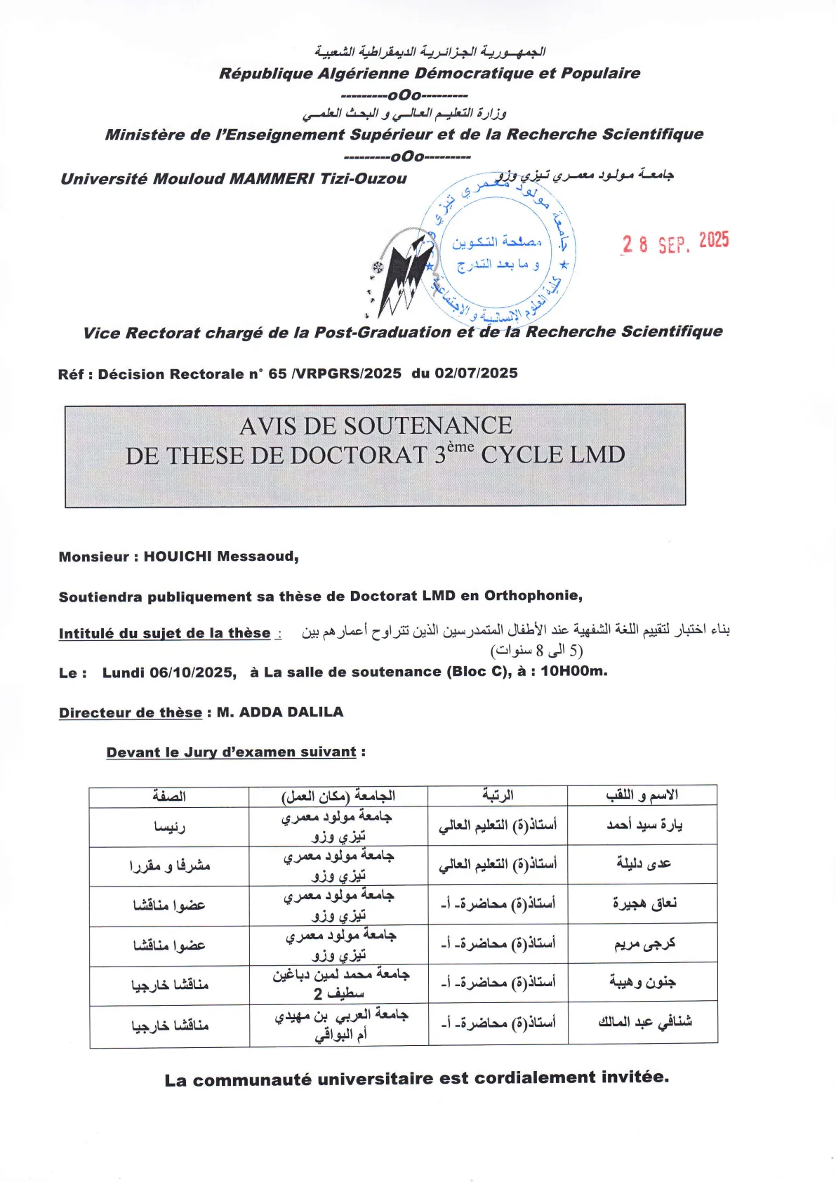 28 Sep 2025 | Avis de soutenance, Doctorat LMD