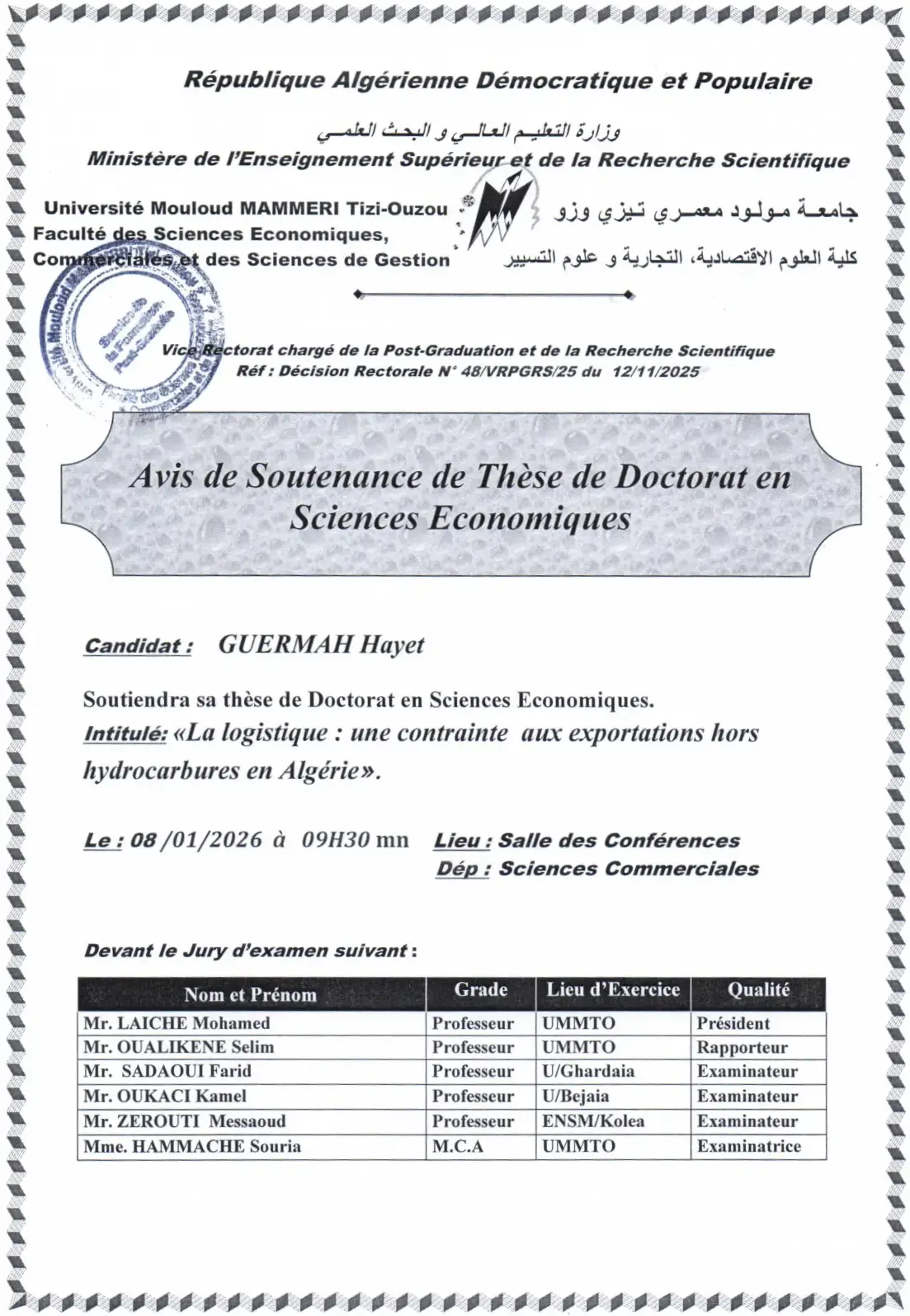 Avis de Soutenance de thèse de Doctorat en sciences économiques de Madame GUERMAH Hayet