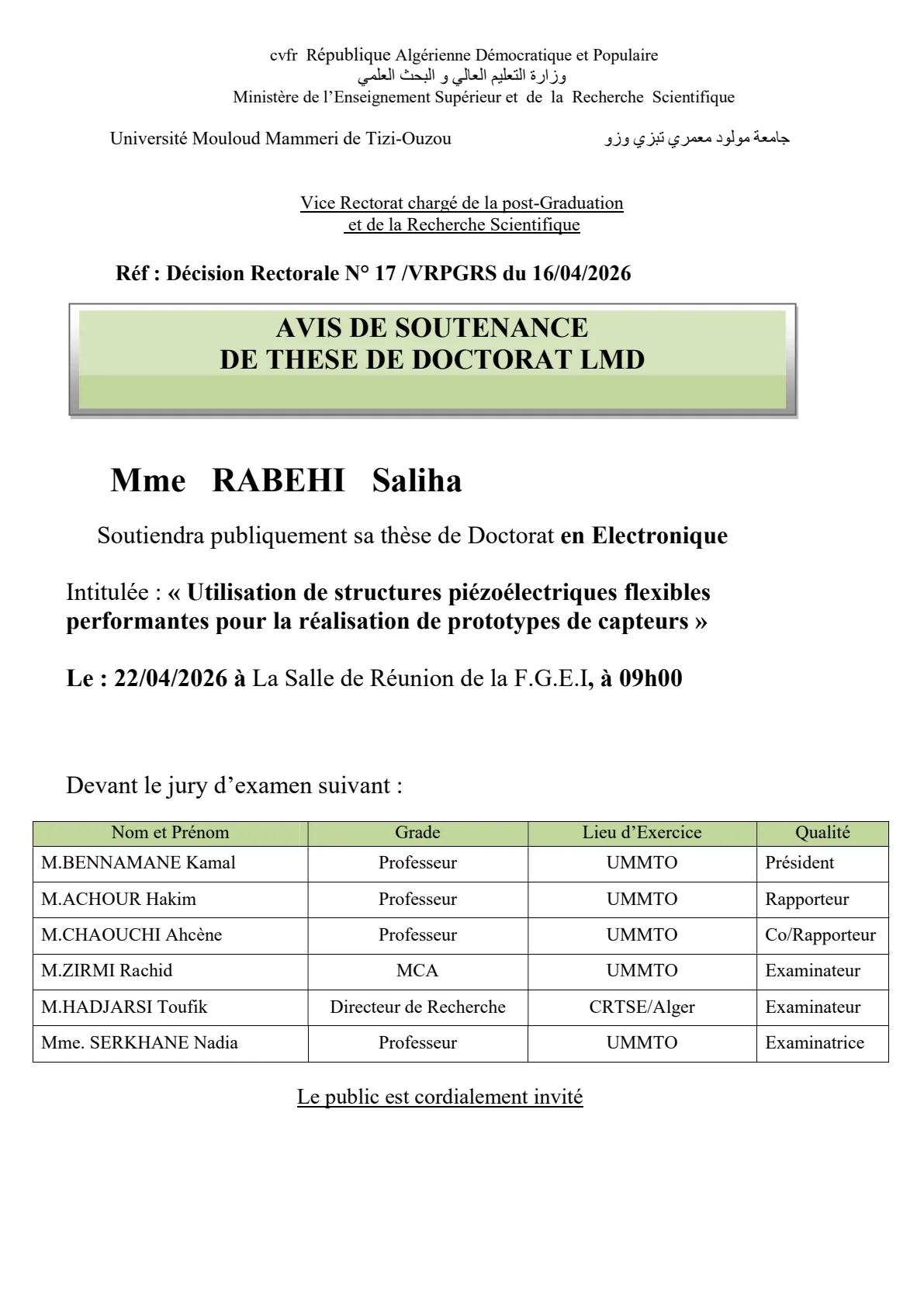 AVIS DE SOUTENANCE DE THESE DE DOCTORAT LMD en Electronique de Mme RABEHI Saliha