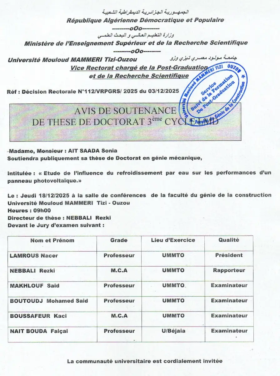 Avis de soutenance de thèse de doctorat LMD en Génie Mécanique de Monsieur BENCHERIF Mokhtar