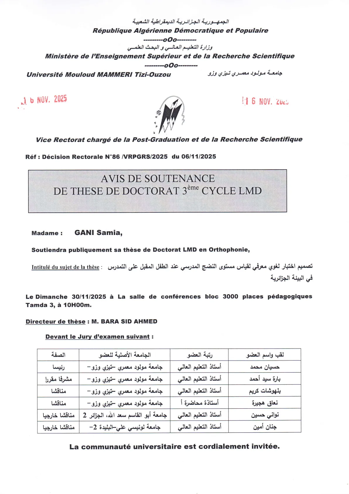 Avis de soutenance de thèse de doctorat LMD en Orthophonie de Madame GANI Samia