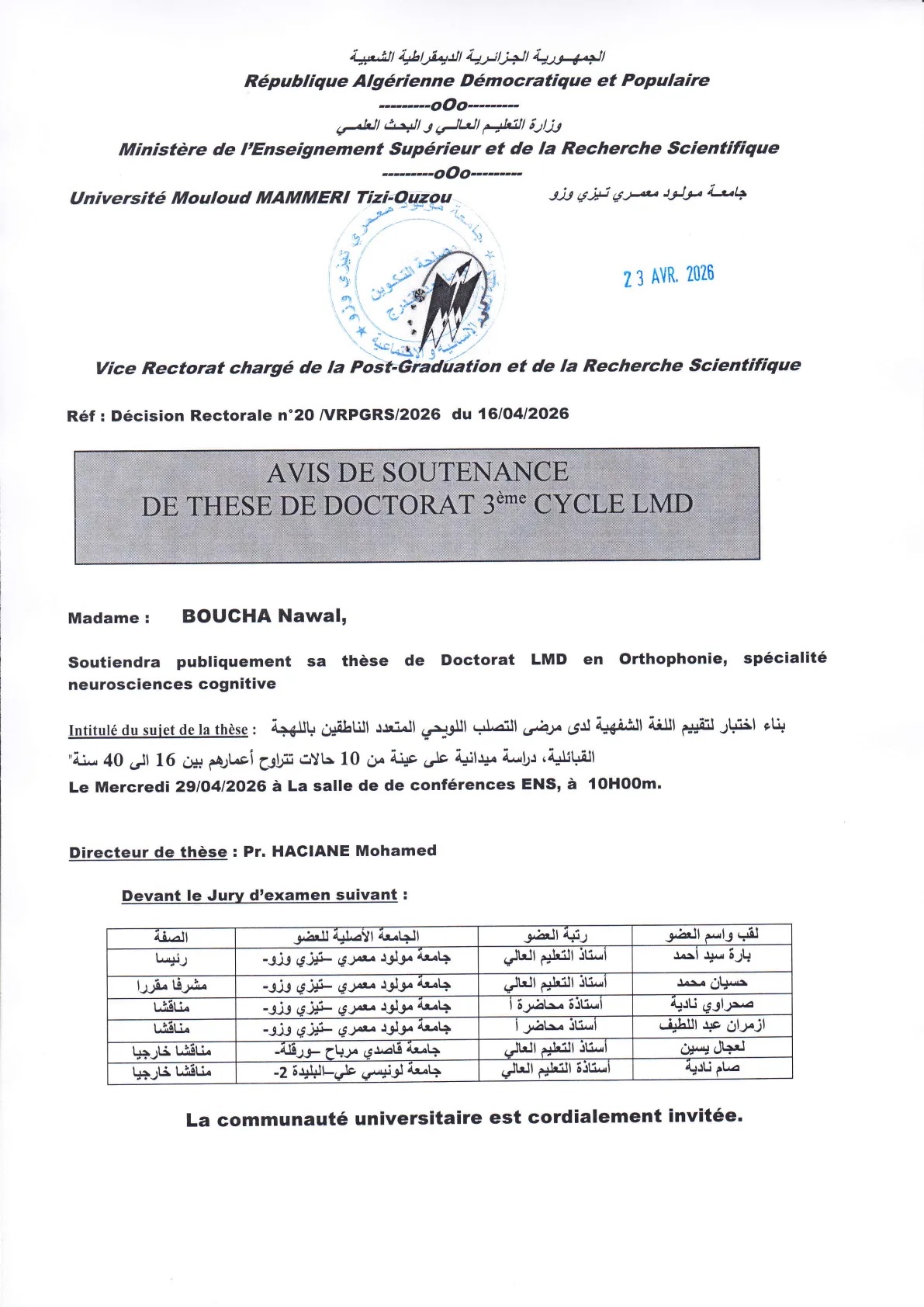 Avis de soutenance de thèse de Doctorat LMD en Orthophonie de Mme BOUCHA Nawal