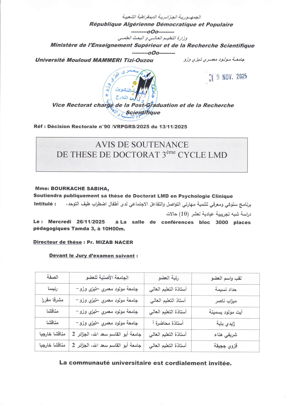 Avis de soutenance de thèse de doctorat LMD en psychologie clinique de Madame BOURKAGHE Sabiha
