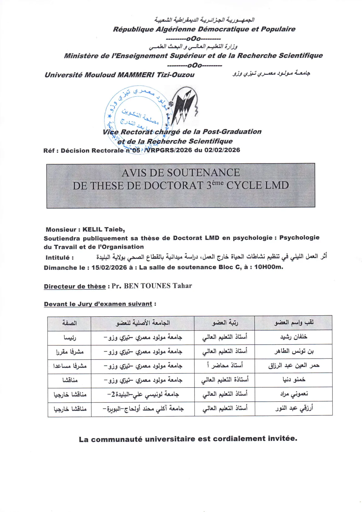Avis de soutenance de thèse de doctorat LMD en psychologie de Monsieur KELIL Taieb