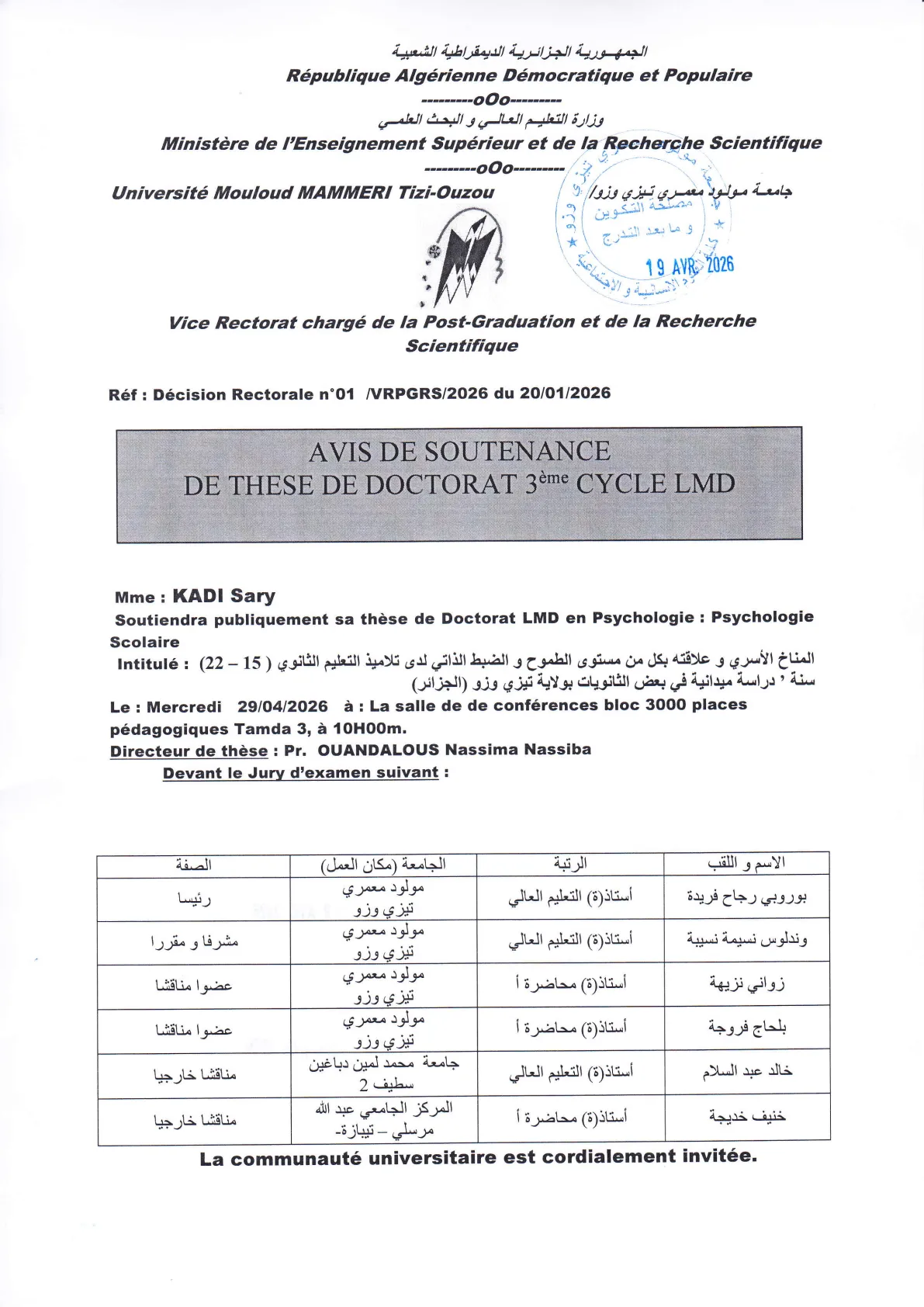 Avis de soutenance de thèse de doctorat LMD en Psychologie scolaire de Mme KADI Sary