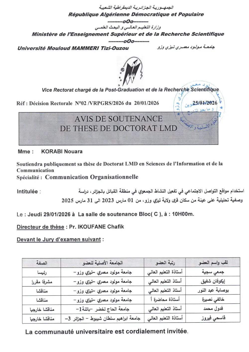 Avis de soutenance de thèse de doctorat LMD en Sciences de l’information et de la communication de Mme KORABI Nouara