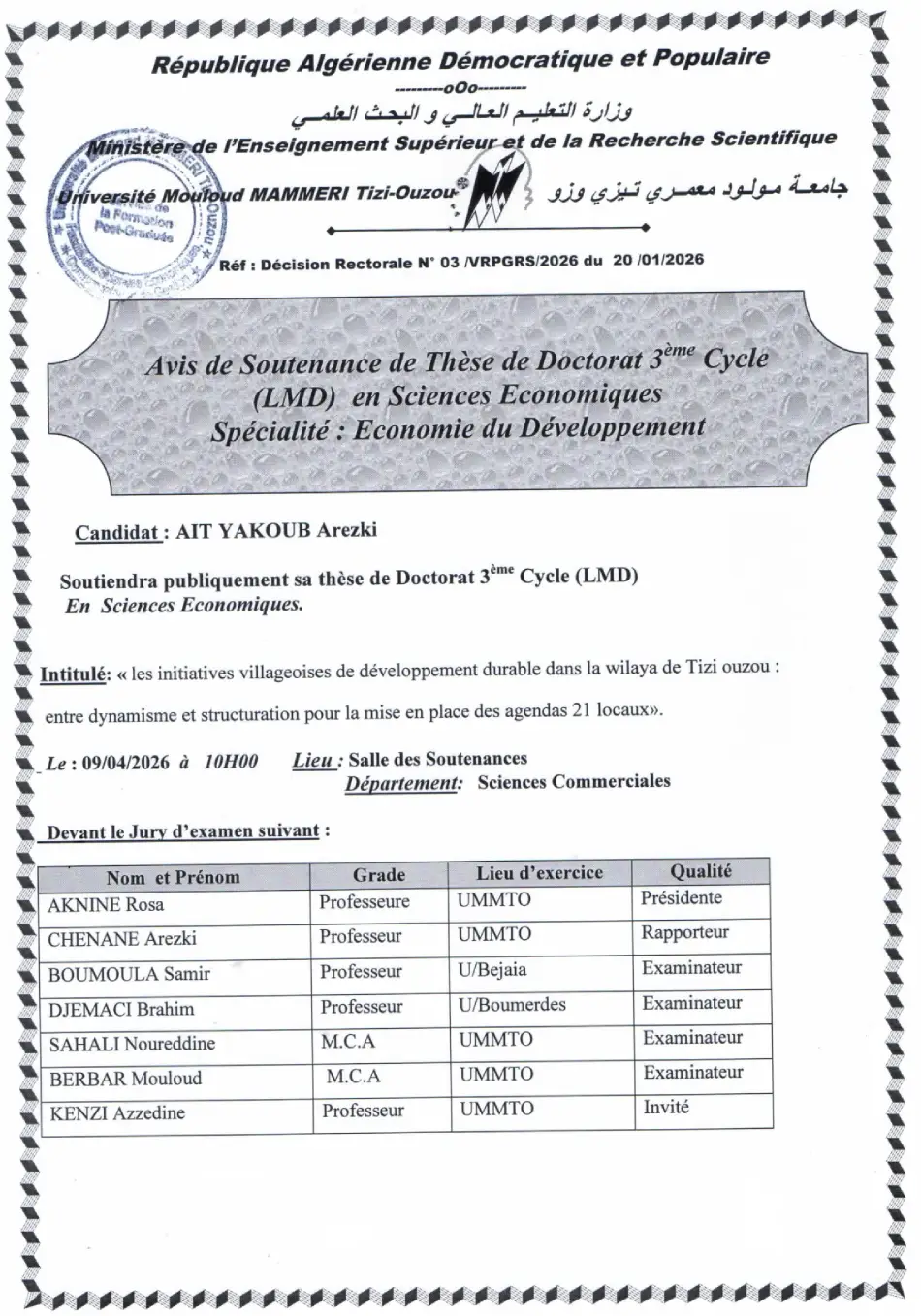 Avis de soutenance de thèse de doctorat LMD en Sciences Economique de Monsieur AIT YAKOUB Arezki