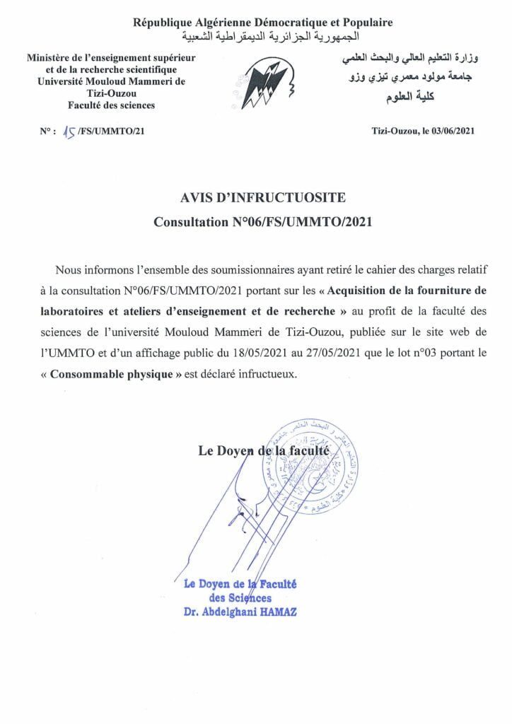 Avis d’infructuosite (Consultation N°06/FS/UMMTO/2021)