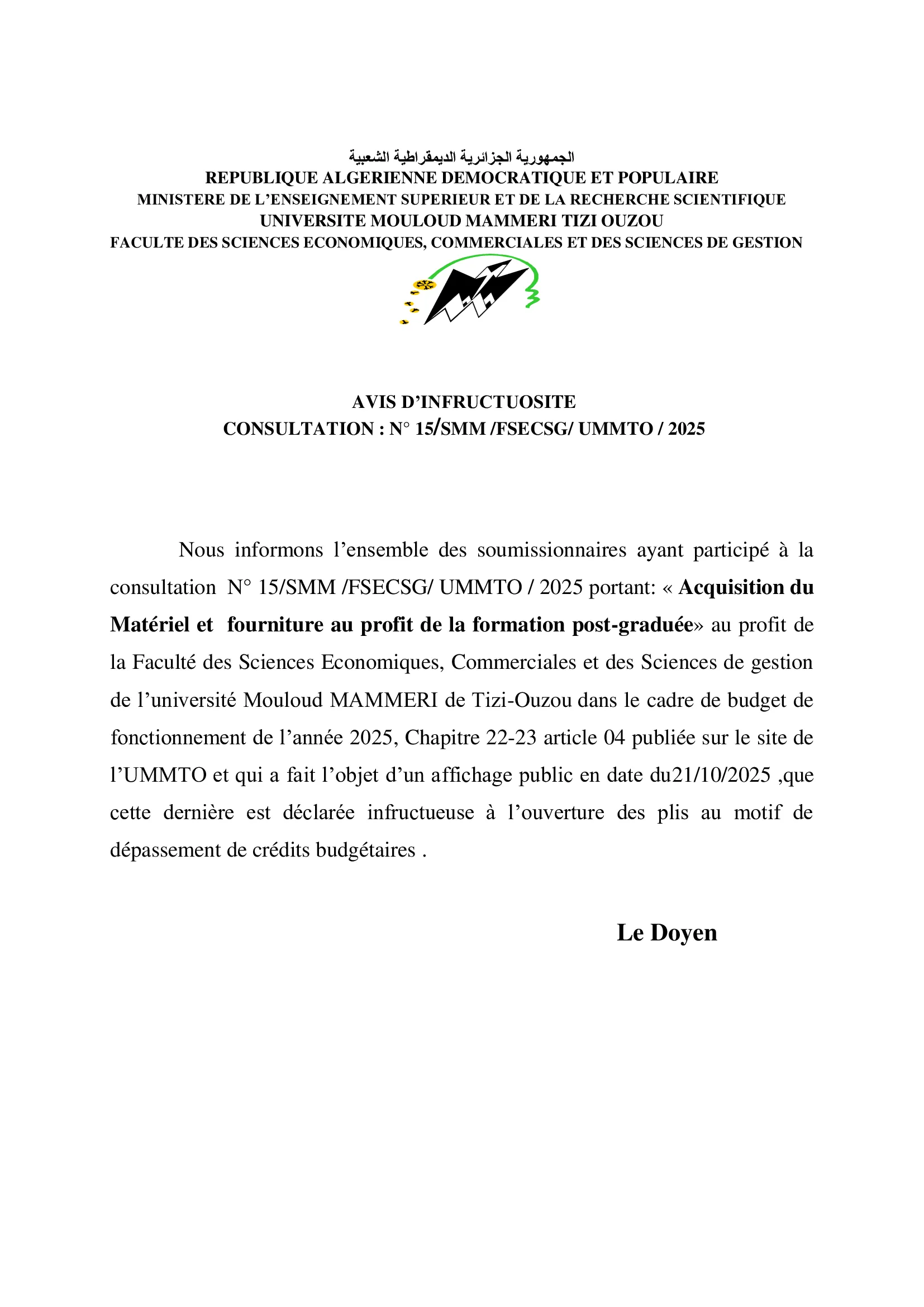 Avis d’infructuosité de la consultation N° 15/SMM /FSECSG/ UMMTO / 2025